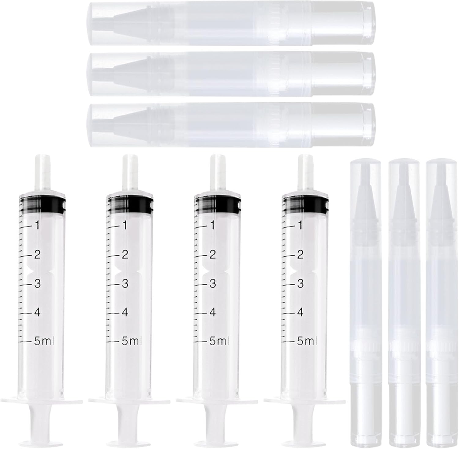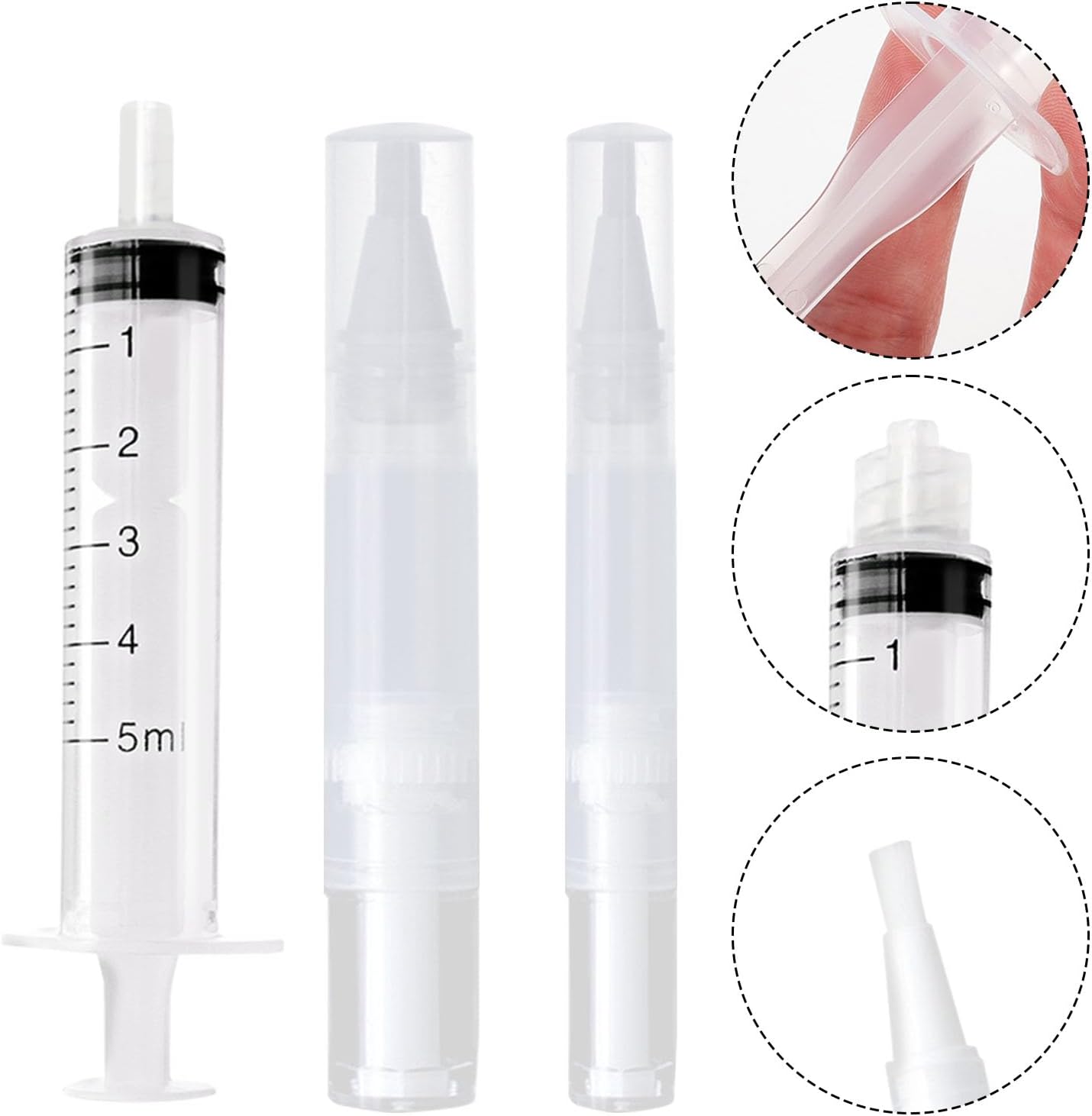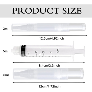Les accessoires de remplissage de 5 ml mesurent environ 9 cm de longueur. Ces dimensions sont adaptées à une utilisation confortable et précise.