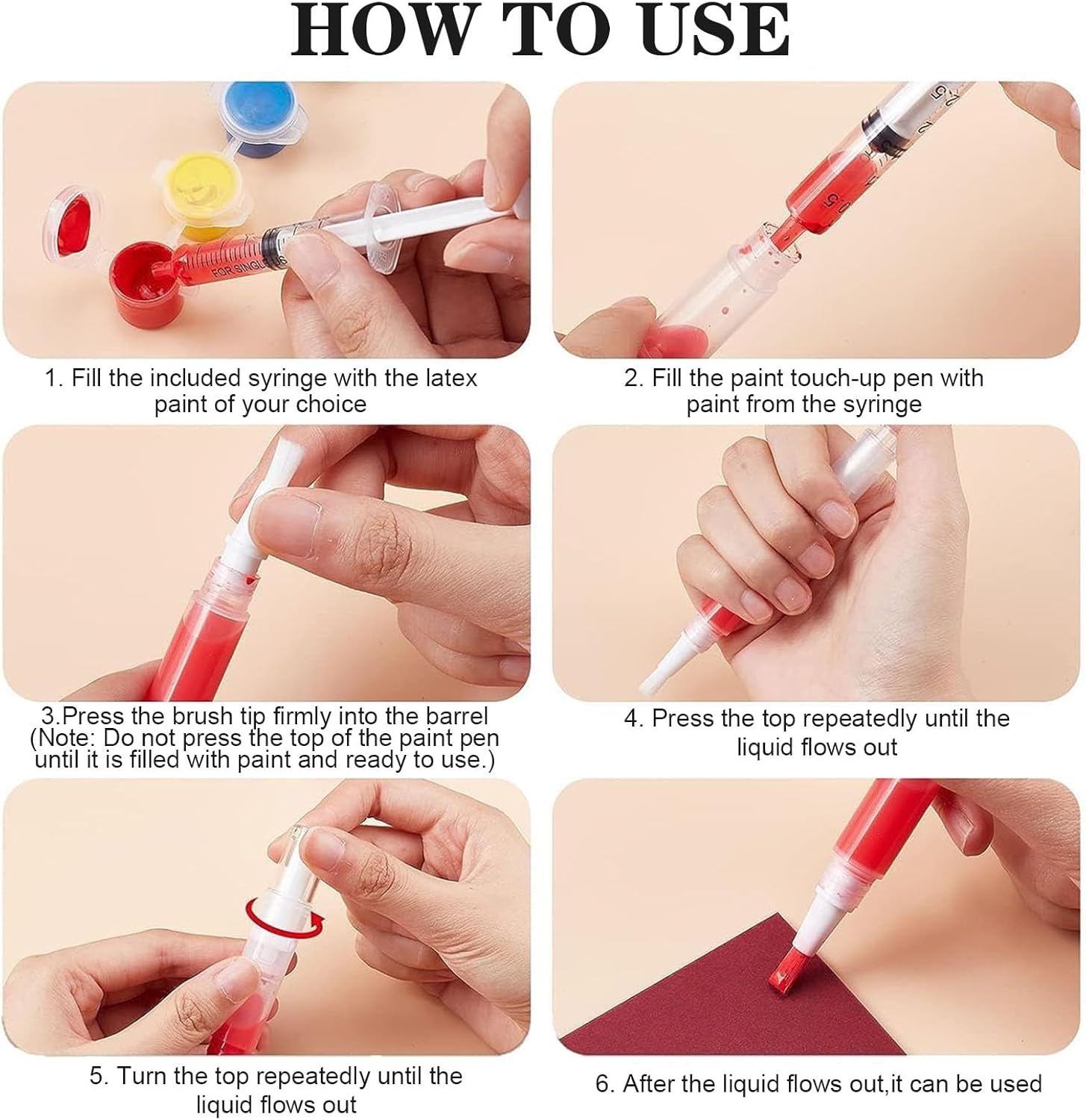 - Remplissez le stylo de retouche avec la peinture de votre choix à l’aide de la seringue de retouche.