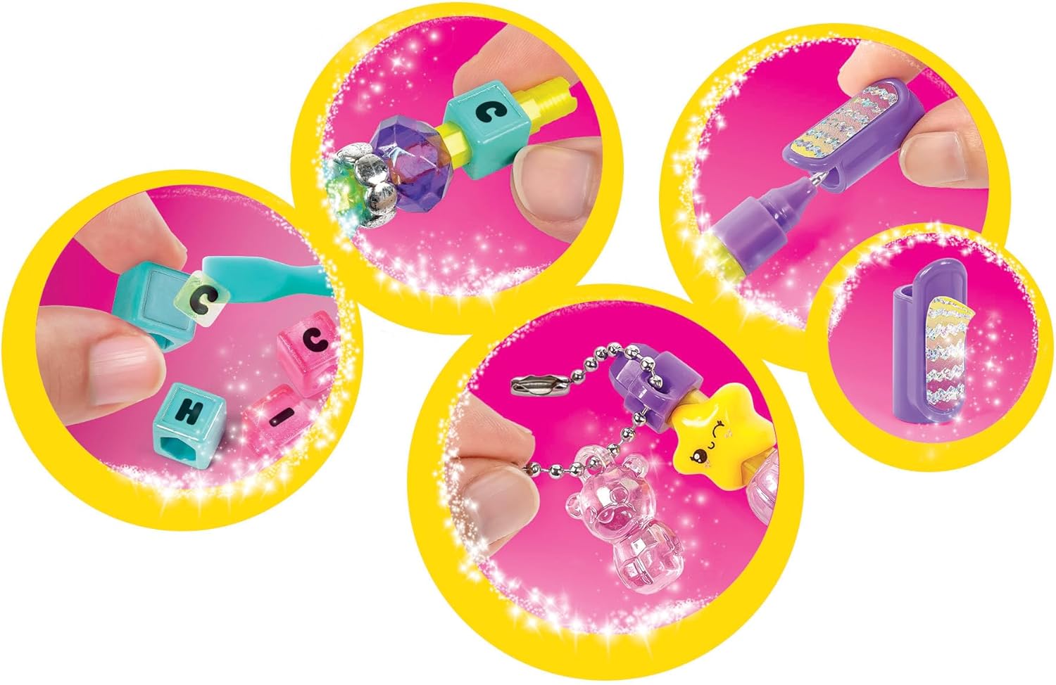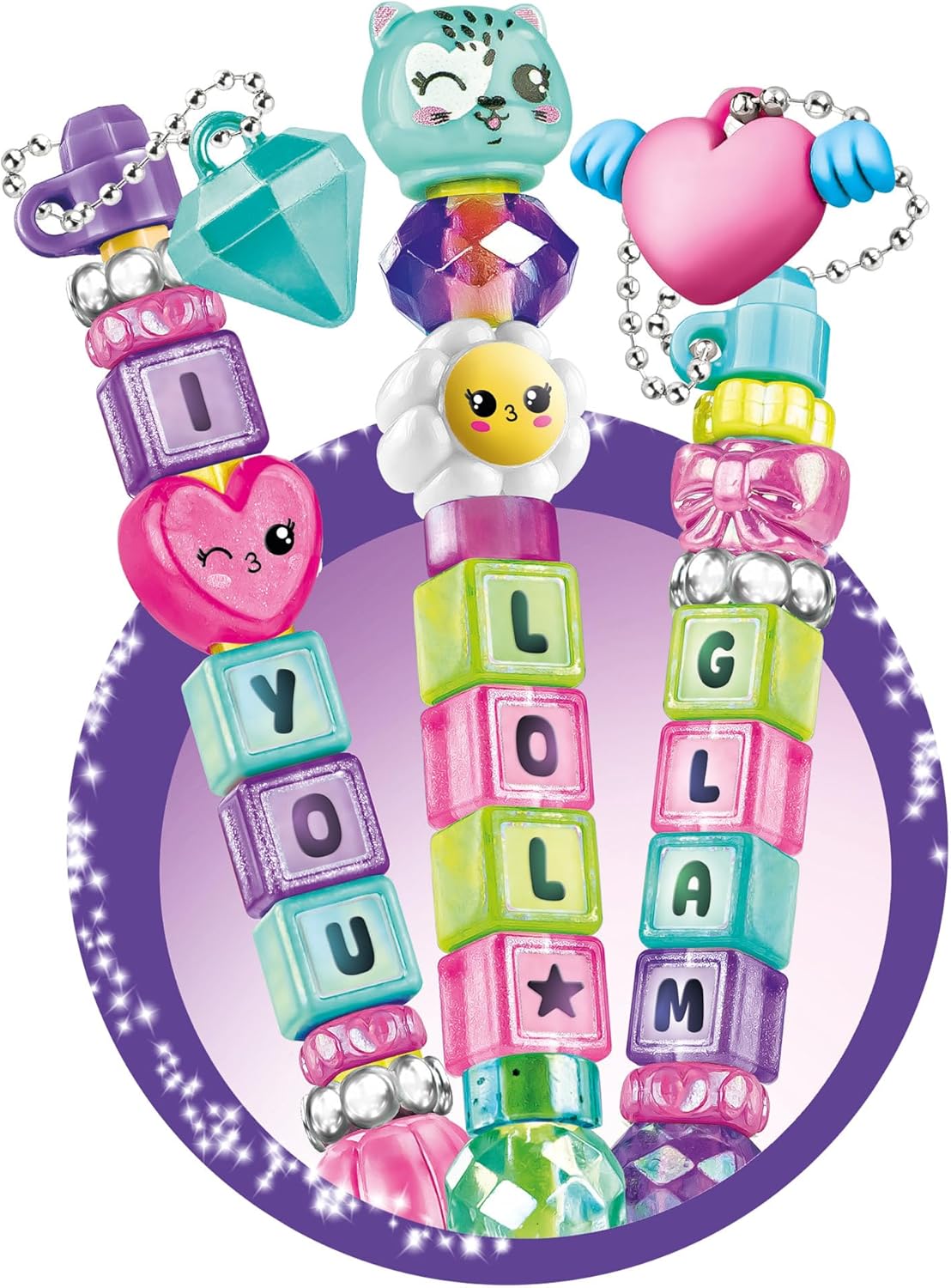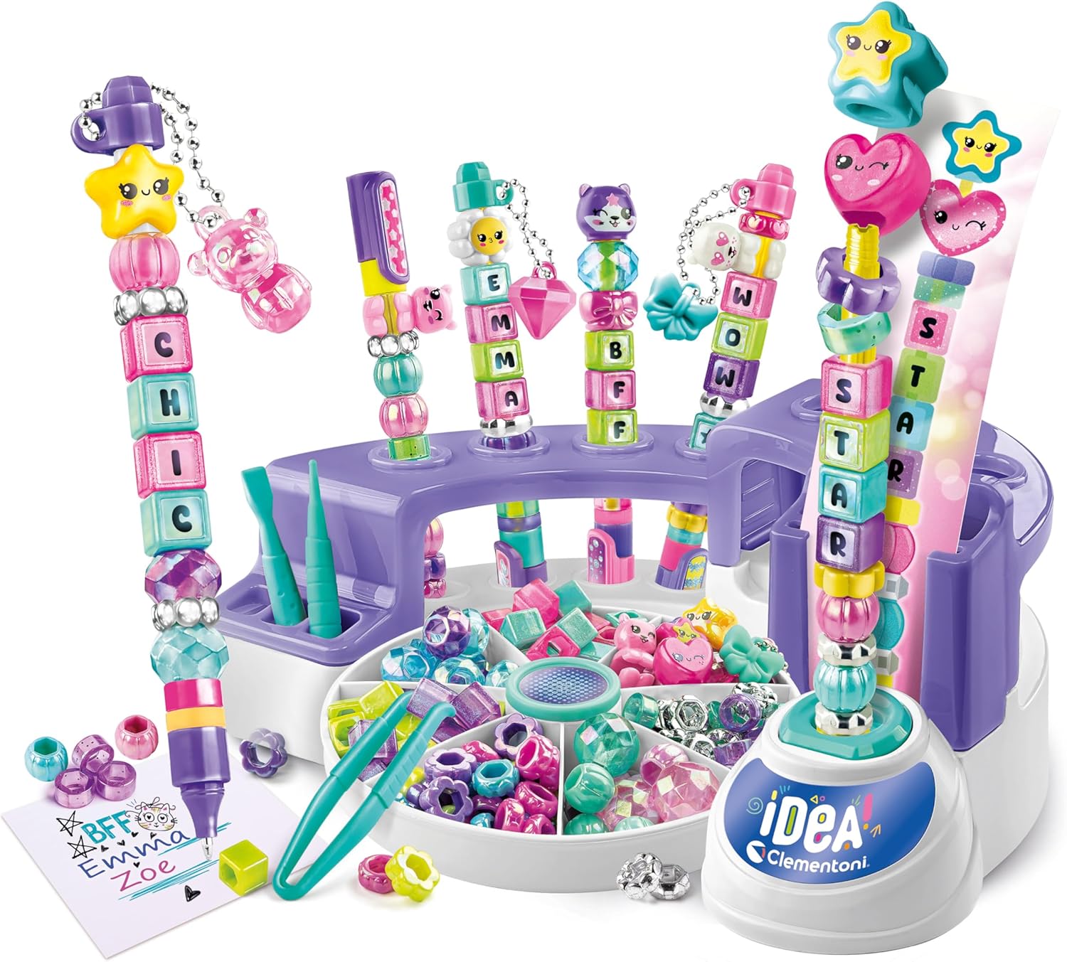 Le coffret contient plus de 100 éléments, dont des perles alphabet, des perles décoratives, des personnages et des autocollants. Chaque accessoire multiplie les combinaisons pour personnaliser les créations avec originalité. (cultura.com)