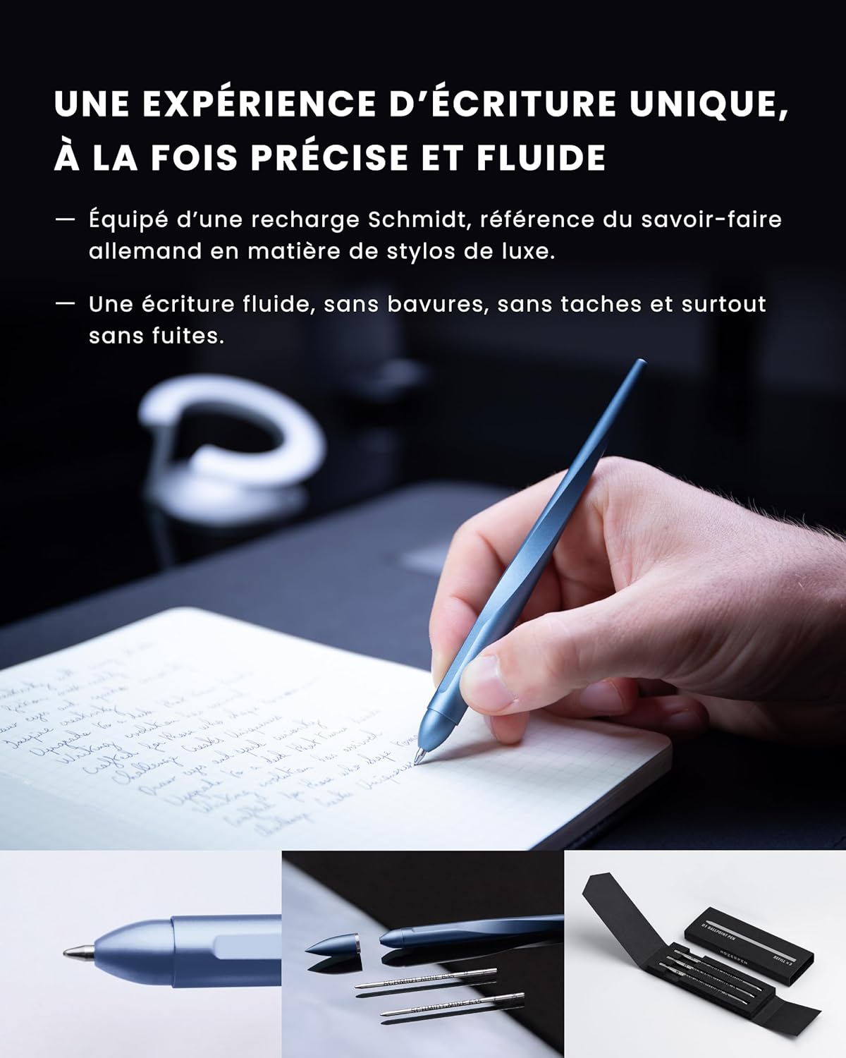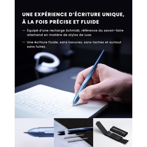 L’Hoverpen est doté d’une recharge Schmidt D1 de couleur noire, taille F, qui assure un rendu de grande qualité. Les traits sont fluides, sans taches ni débordements. Vous disposerez également d’une recharge supplémentaire bleue, garantissant que votre expérience d’écriture demeure impeccable au fil du temps. Que vous signiez des documents importants ou que vous griffonniez des idées, l’Hoverpen assure une prise en main agréable et un confort d’utilisation optimal.