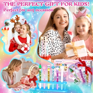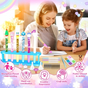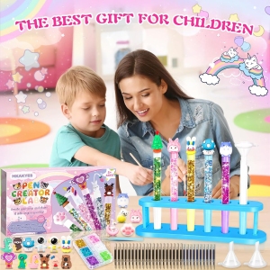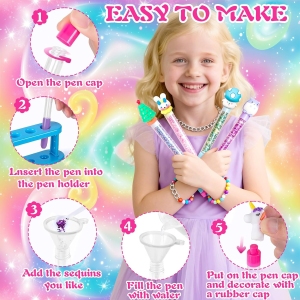 Ce kit créatif offre aux enfants la possibilité de créer des stylos personnalisés en toute autonomie. Les capuchons décoratifs et les paillettes colorées stimulent l’imagination, permettant aux enfants de concevoir des stylos uniques avec des motifs variés tels que des lapins, des astronautes ou des dinosaures. Cette activité manuelle favorise le développement de la motricité fine et de la coordination œil-main, tout en encourageant la patience et la résolution créative de problèmes.