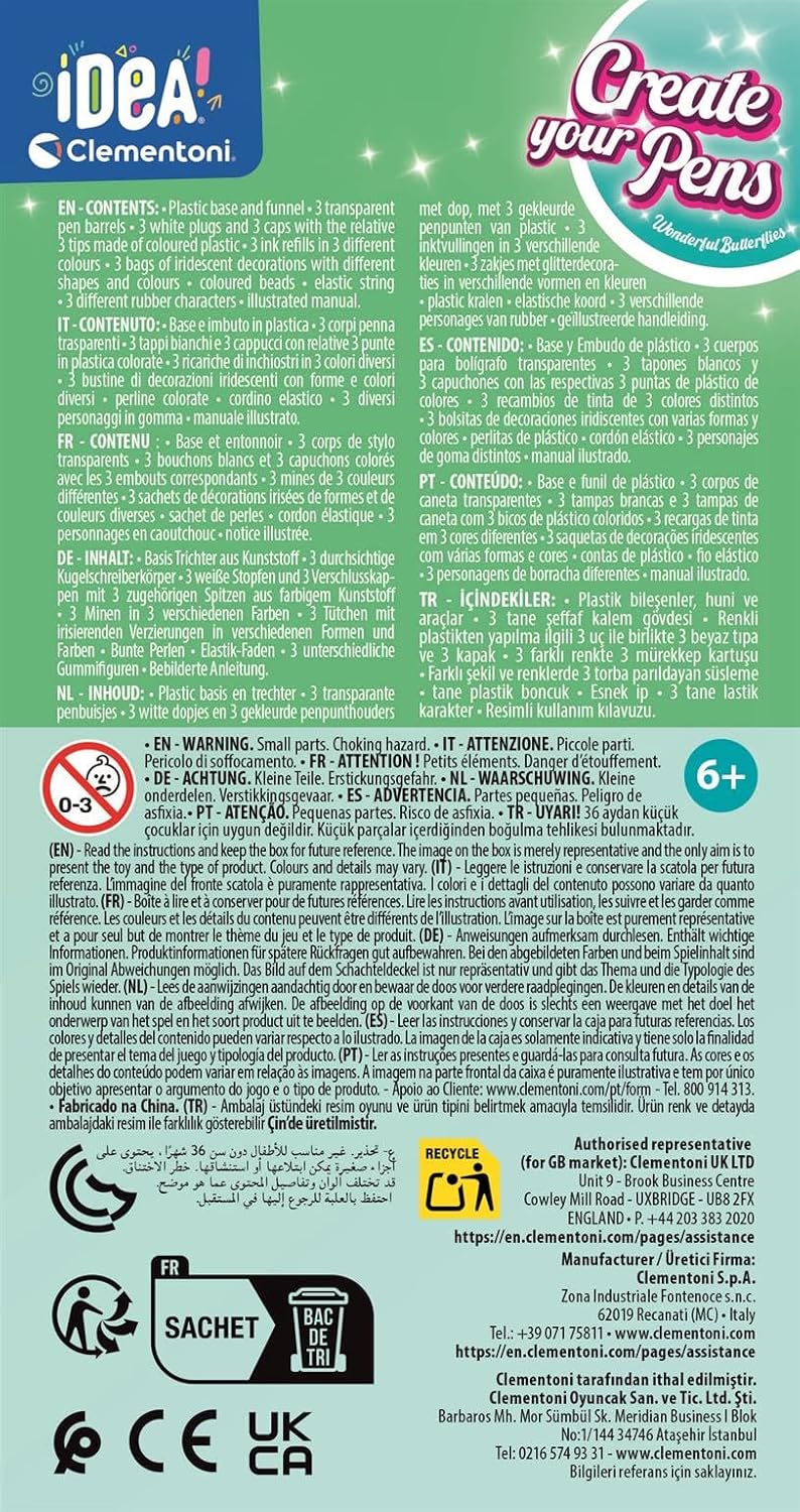En somme, le kit Clementoni Idea – Create Your Pens: Wonderful Butterflies est une idée brillante pour stimuler la créativité des enfants. C’est un produit engageant, que ce soit pour un moment de jeu seul ou partagé. Avec une palette de couleurs attrayantes et la possibilité de personnaliser les stylos, ce coffret ne manquera pas de séduire les jeunes artistes en herbe. Offrez-le en cadeau, et vous serez certain de faire plaisir tout en encourageant l’expression personnelle et la créativité !