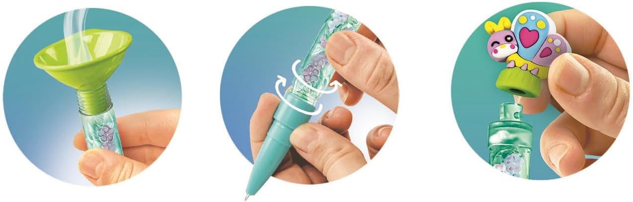 Le coffret propose une expérience unique de personnalisation. Les enfants peuvent assembler les stylos à leur guise et les décorer grâce aux multiples accessoires inclus, tels que des bouchons colorés, des capuchons fantaisie et des décorations sur le thème des papillons. Quatre encres de couleurs variées permettent de donner libre cours à leur créativité. Que ce soit pour écrire, dessiner ou colorier, chaque stylo devient une pièce maîtresse aux couleurs vibrantes et aux designs uniques.