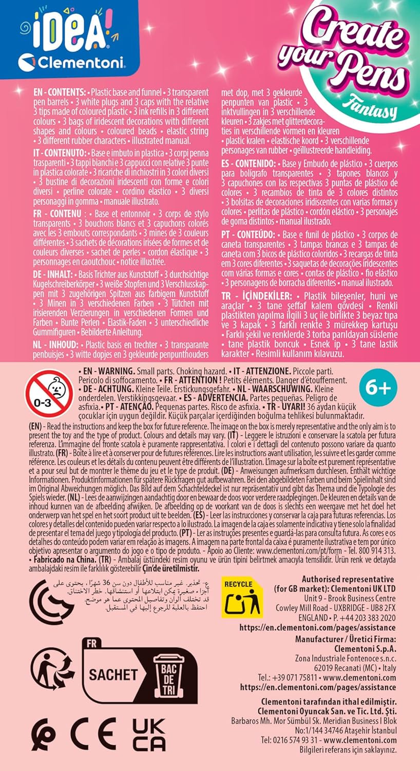 Le coffret Clementoni | Idea! Fantasy Pens pour Enfants 6 Ans+ est une véritable invitation à plonger dans l’univers ludique et créatif des activités manuelles. Destiné aux enfants de 6 ans et plus, ce kit DIY permet aux jeunes artisans de concevoir et personnaliser trois stylos originaux, tout en stimulant leur imagination et leur créativité.