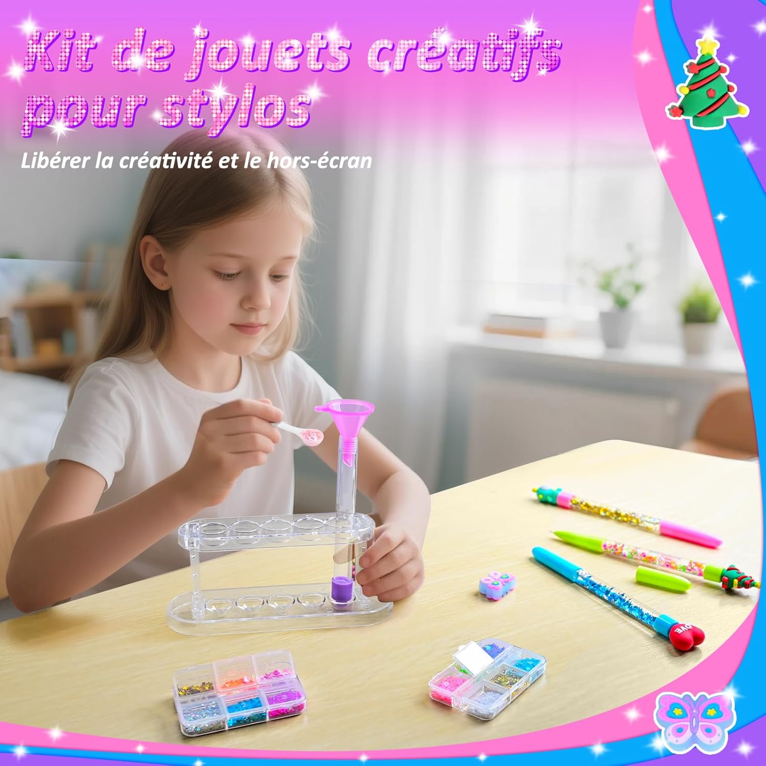 Excellent kit de fabrication de stylo. Les paillettes sont variées, en forme et en couleur. Le kit est complet, permet de faire plusieurs stylos en même temps grâce au porte stylos.Les explications sont claires et tout est simple à faire. Mes filles de 4 et 7 ans sont fières d’avoir fait leurs propres stylos.