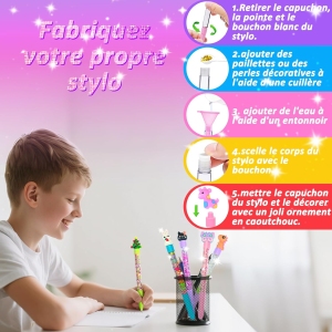 Le kit comprend tout ce dont votre enfant a besoin pour créer des stylos uniques : 20 recharges, 12 stylos, et diverses décorations en caoutchouc comme des animaux et des formes adorables. Les petites mains peuvent s’amuser en ajoutant des paillettes colorées, des perles et en utilisant des outils pratiques tels qu’un entonnoir et une cuillère pour un processus de création sans encombre. Chaque étape est guidée, ce qui facilite la réalisation des projets, même pour les novices en bricolage.