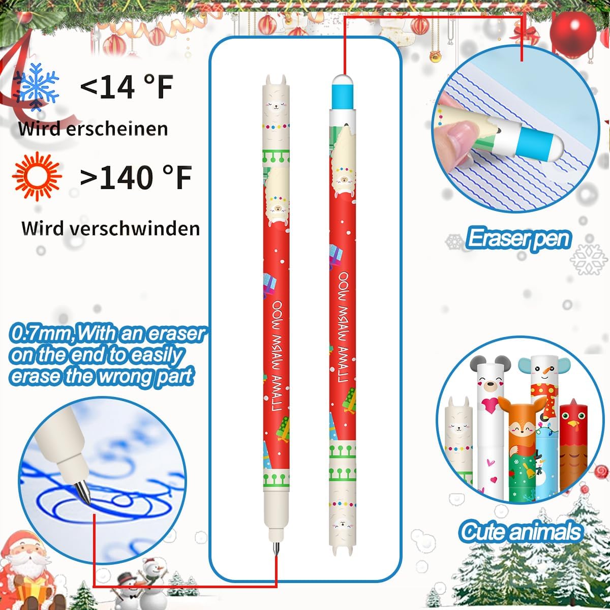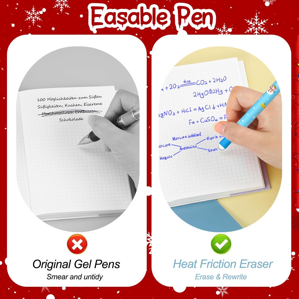 Le Lot de 12 stylos effaçables gel Noël est la solution idéale pour tous ceux qui aiment écrire, dessiner ou gribouiller tout en ayant la possibilité d’effacer leurs erreurs. Dotés d’une encre spéciale effaçable thermique, ces stylos offrent une expérience d’écriture fluide, tout en permettant une remise à zéro instantanée, idéale pour les enfants, les étudiants ou les professionnels. Avec une pointe de 0,7 mm, ils sont parfaits pour une écriture précise et soignée.