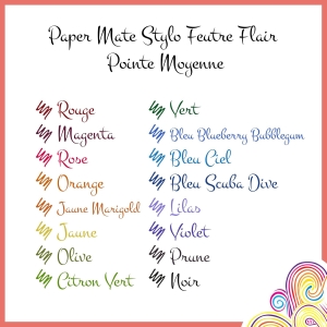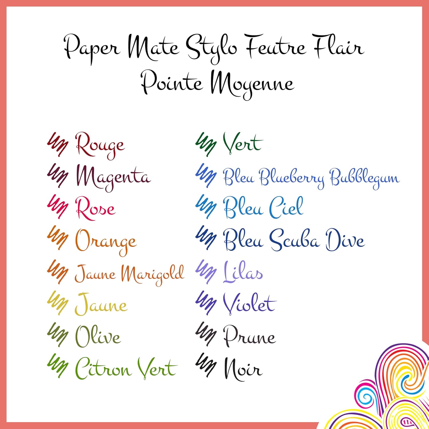 Un autre point fort des stylos feutres Paper Mate Flair est la diversité de couleurs qu’ils offrent. Avec un assortiment de 16 couleurs vives, vous avez un large éventail d’options pour exprimer votre créativité. Chaque couleur est soigneusement sélectionnée pour non seulement égayer vos écrits, mais aussi pour donner vie à vos projets artistiques. Les teintes individuelles sont conçues pour rester éclatantes, garantissant que vos œuvres d’art ne perdent pas de leur charme avec le temps.