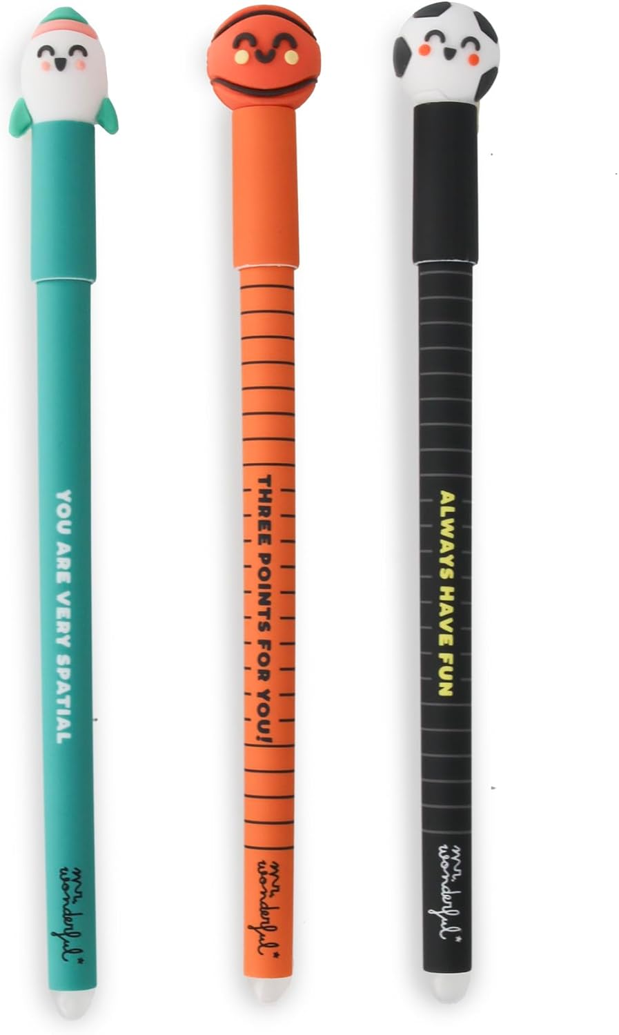 Les stylos effaçables Bo-Bo de Mr. Wonderful apportent une touche ludique et fonctionnelle à votre quotidien. Ce lot de trois stylos, chacun orné d’un personnage distinctif — le ballon de basket, le ballon de football et la fusée —, est conçu pour allier plaisir et praticité.