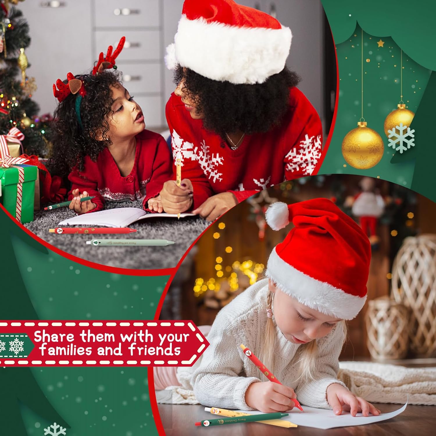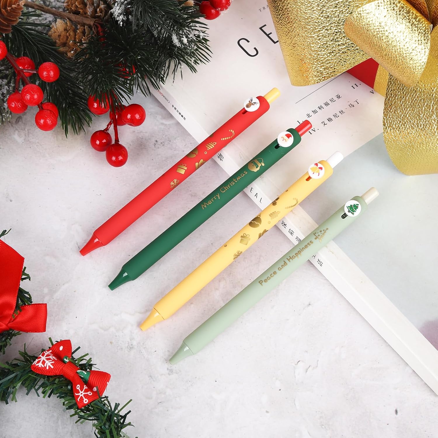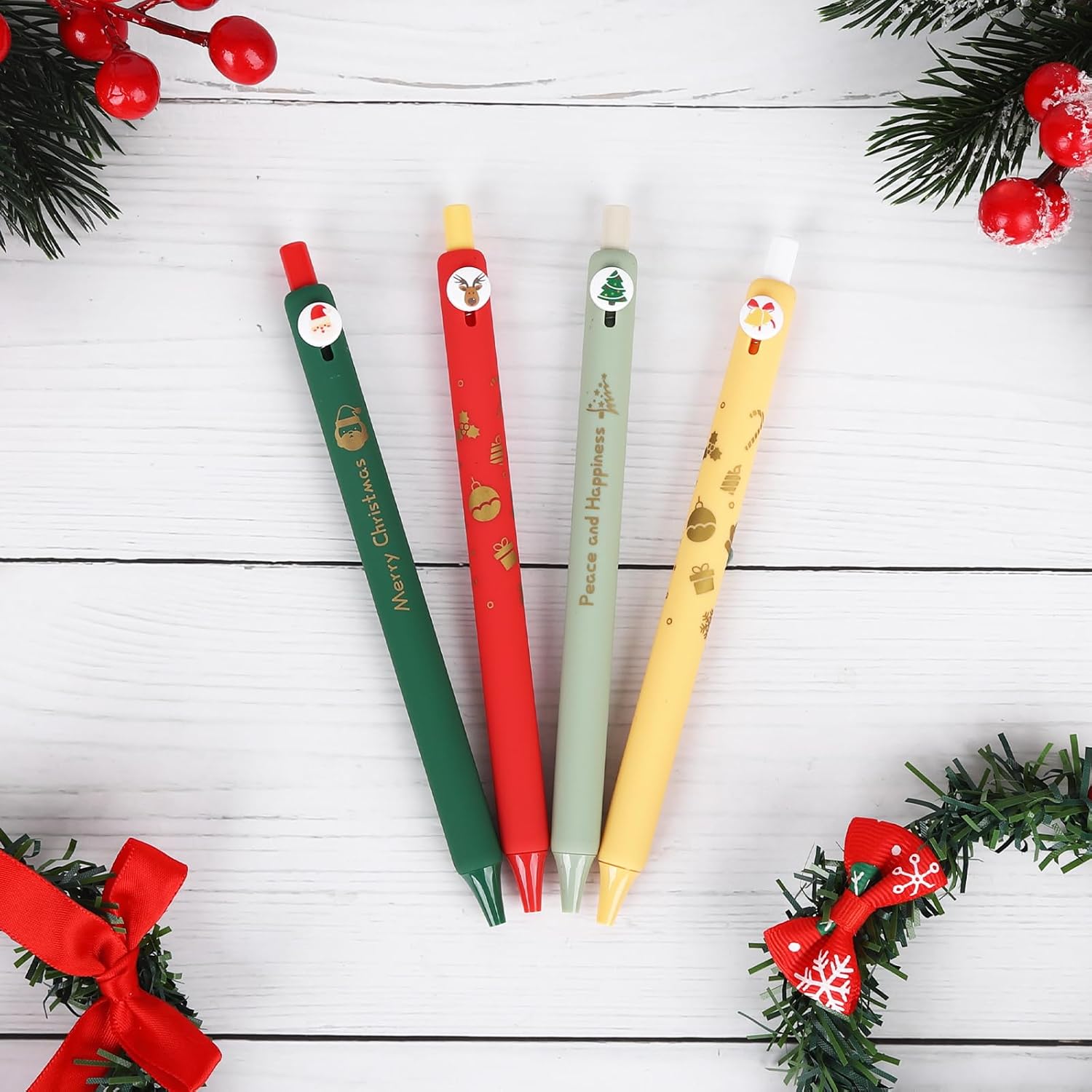 Les stylos à bille sont conçus avec un souci du détail, présentant des illustrations charmantes qui évoquent spirituellement la saison des fêtes. Les couleurs vives (vert, vert beige, rouge et curcuma) rendent ces stylos non seulement esthétiquement plaisants, mais ils sont également faciles à repérer dans une trousse ou sur un bureau. Chaque stylo se distingue par des motifs emblématiques comme les chapeaux du Père Noël et les cimes des sapins, permettant d’écrire dans une atmosphère joyeuse.