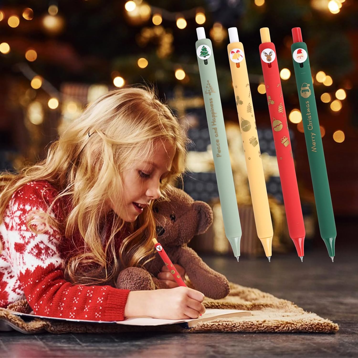 Les stylos à bille de Noël sont le cadeau parfait pour célébrer la magie des fêtes tout en alliant fonctionnalité et esthétisme. Le lot de quatre stylos gel noirs 0,42 mm, rétractables, est non seulement pratique pour les étudiants, les professionnels et les familles, mais il apporte aussi une touche festive à chaque écriture. Ces marqueurs, ornés de motifs tels que des bonshommes de neige, des sapins de Noël, des rennes et le célèbre Père Noël, ajoutent une ambiance joyeuse et accueillante à vos notes ou messages.