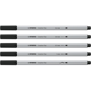 Les feutres STABILO Creative Tips sont conçus pour éveiller votre créativité et vous offrir la liberté d’exprimer votre art visuellement. Avec un ensemble de cinq feutres soigneusement sélectionnés, comprenant des pointes de différentes tailles allant de 0,2 mm à 1 mm, y compris une pointe pinceau, chaque utilisateur peut réaliser des dessins, de la calligraphie ainsi que des effets aquarelle uniques. La palette de pointes, déclinée en noir, permet de varier les styles et les épaisseurs, rendant agrément chaque projet artistique d’une touche personnelle.