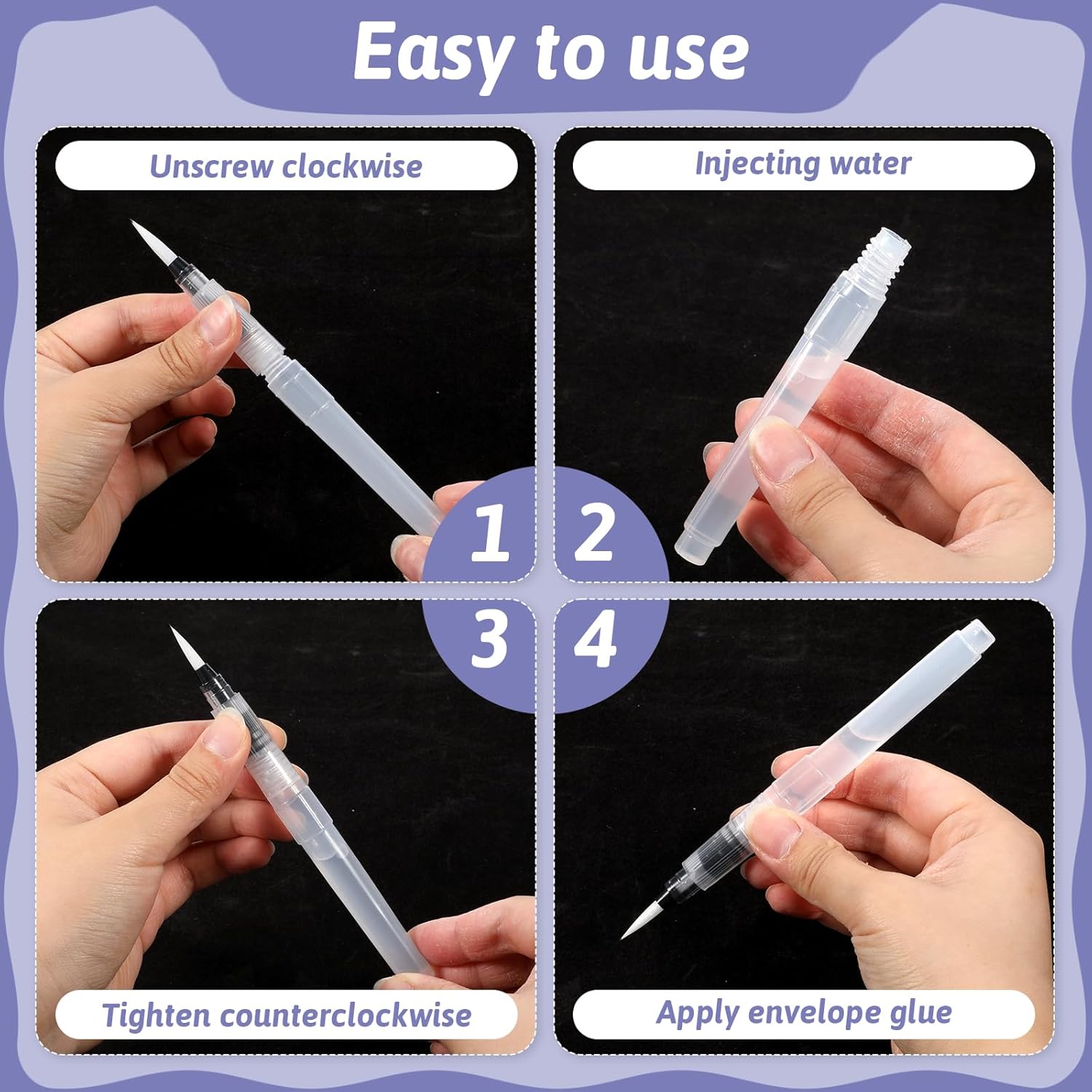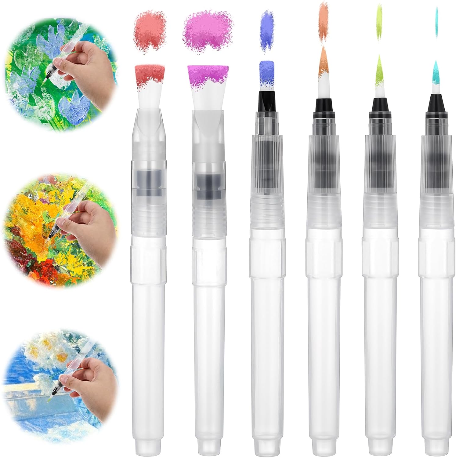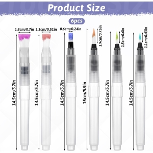 Le lot se compose de six pinceaux, chacun avec une tête de taille différente. Cette variété permet aux utilisateurs de réaliser des techniques diverses, allant des traits fins aux surfaces plus larges. Que vous peinturiez des détails minutieux ou que vous remplissiez de grandes zones, les pinceaux à réservoir d’eau sont adaptés à tous les styles de peinture.