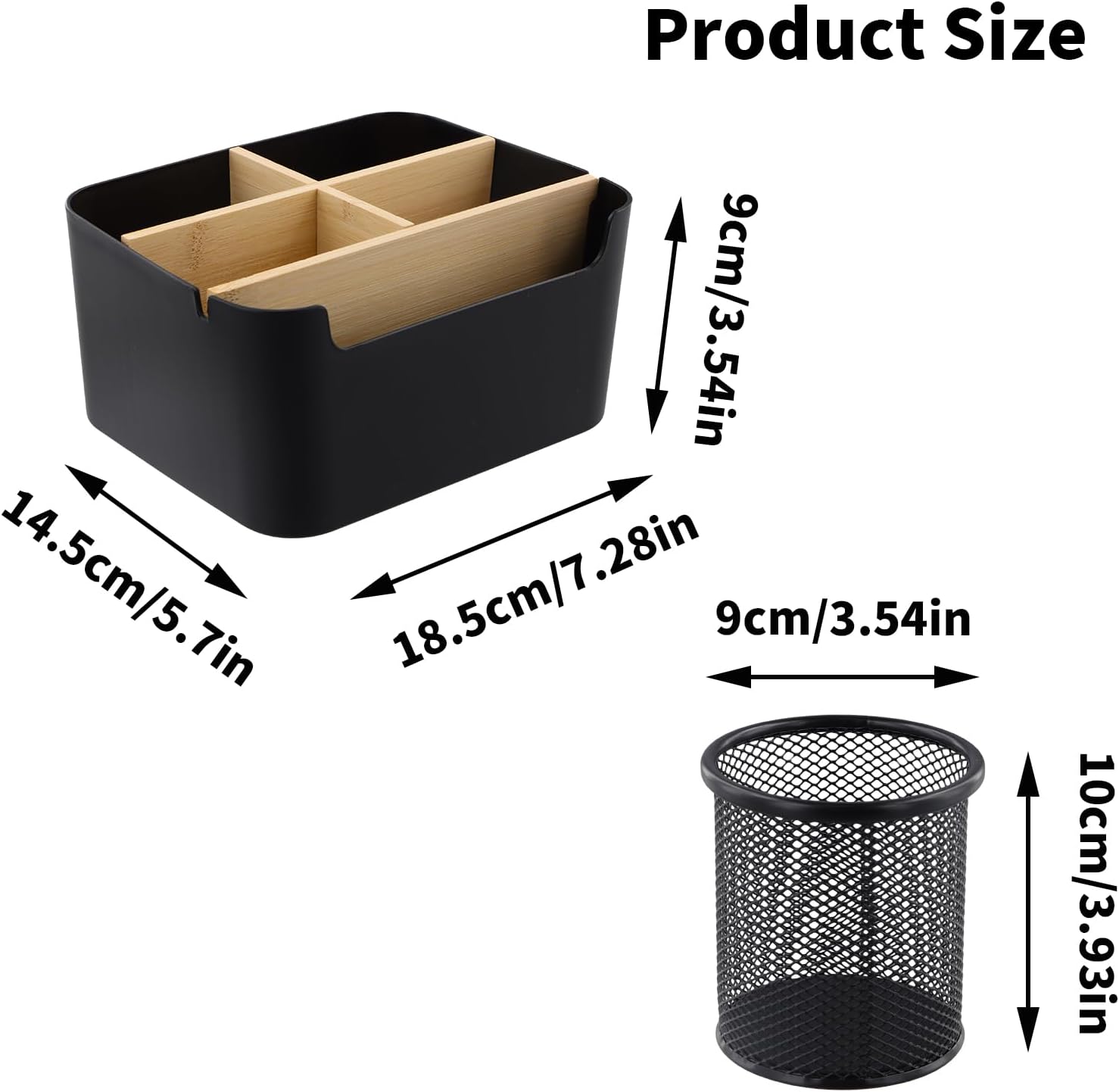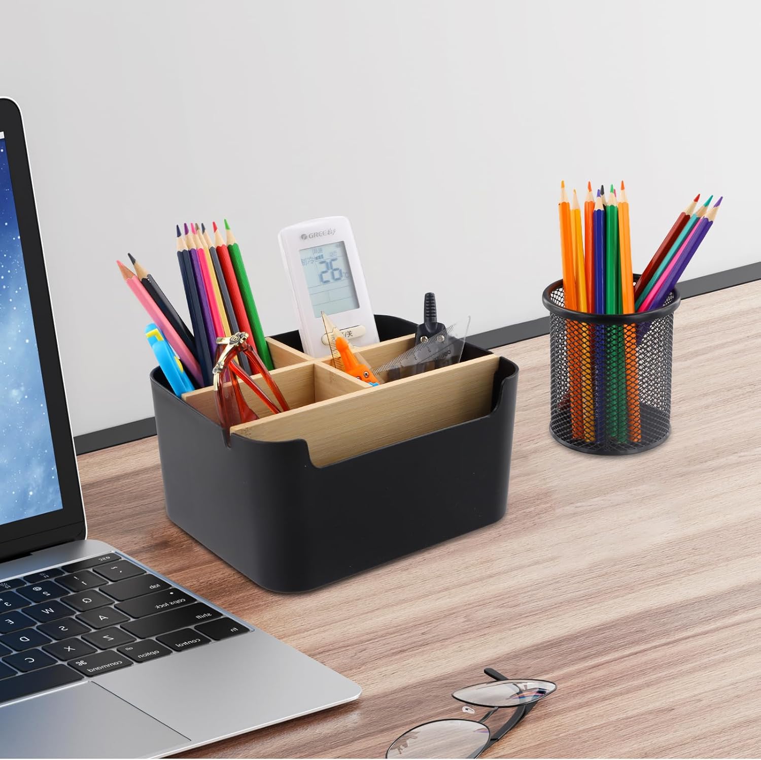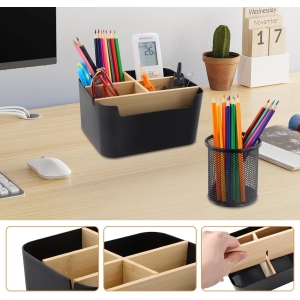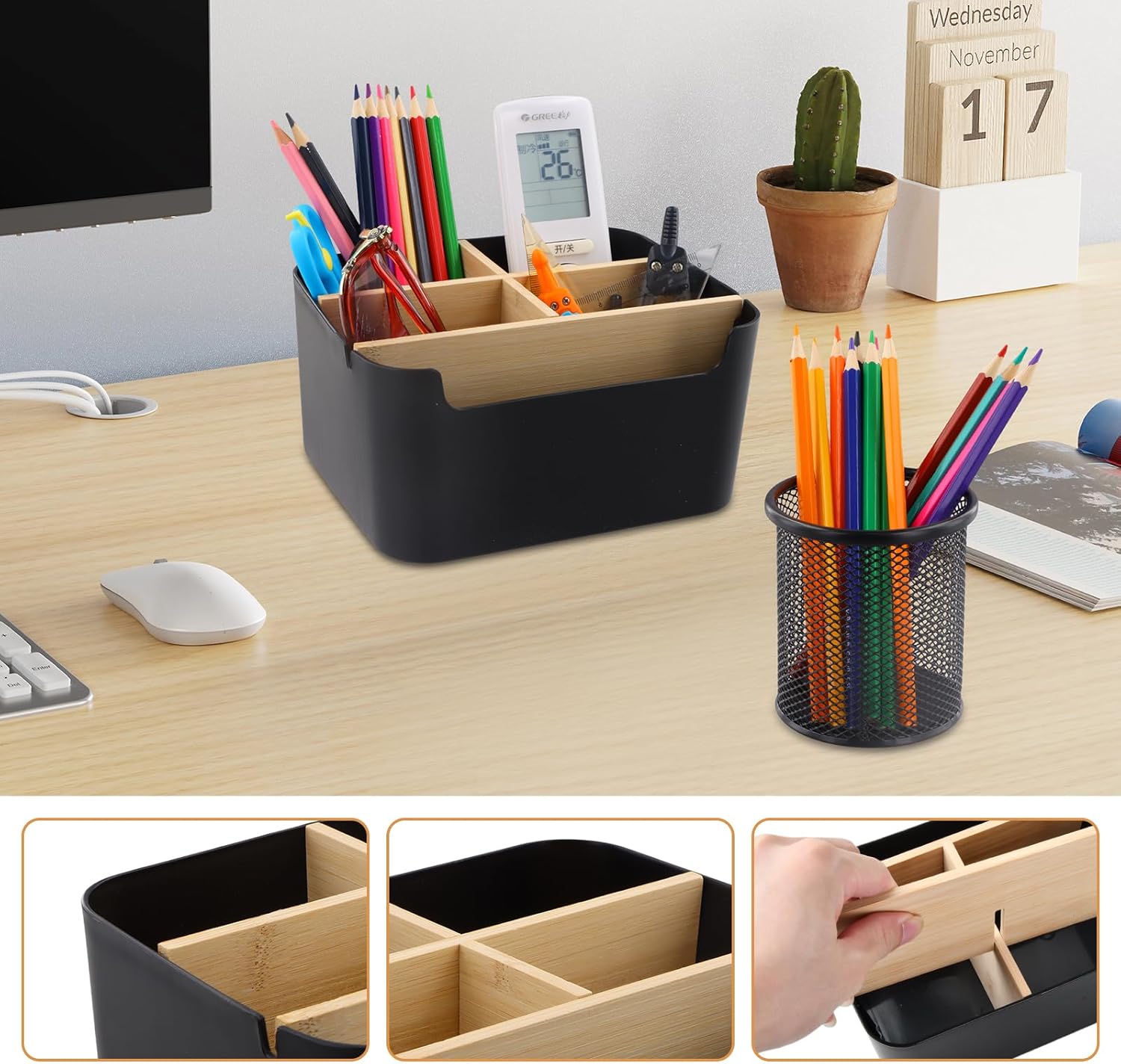L’organiseur de bureau en bambou et bois offre une solution de rangement élégante et pratique. Sa conception polyvalente permet de ranger non seulement des fournitures de bureau telles que stylos et crayons, mais aussi des télécommandes, des cosmétiques, et bien d’autres petits objets du quotidien. Grâce à son esthétique soignée, il s’intègre facilement dans n’importe quel décor, qu’il s’agisse d’un bureau moderne, d’un espace de travail traditionnel ou même d’une chambre à coucher.