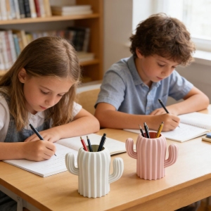 Le design en forme de cactus est à la fois original et ludique. Avec ses épines douces et ses courbes modernes, il apporte une ambiance joviale à n’importe quel bureau ou espace de travail. Contrairement aux porte-stylos habituels, souvent ternes et peu inspirants, ce pot se distingue par sa personnalité, transformant un simple accessoire fonctionnel en une pièce maîtresse décorative. Vous pouvez le placer sur votre bureau, à côté de votre lavabo ou même sur une étagère, et il illuminera instantanément l’atmosphère environnante.