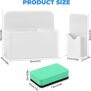 Son tres portalápices, dos de igual tamaño (12×5,7 cm.) y un tercero más grande (12×10 cm.). Resultan ideales para colocar en una pizarra magnética, al lado de la mesa de estudio, y así no ocupar espacio en la mesa. También son perfectos para poner imantados a la pizarra donde pintan los peques de la casa y utilizar los dos borradores que trae para limpiar lo que escriben en ella.Son la solución para colocar nuestros lápices, bolígrafos, rotuladores, tenerlos a mano y así disponer de más zona de trabajo. Al ser blancos, combinan con cualquier estilo decorativo.
