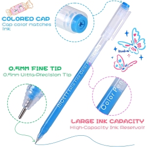 fantastic set of gel pens ! they are thin , the caps click in place very nicely , the colour range is wonderful , great for colouring in detail . the ink flow is good and it dries pretty fast . very happy with my purchase , good value for money