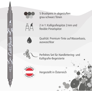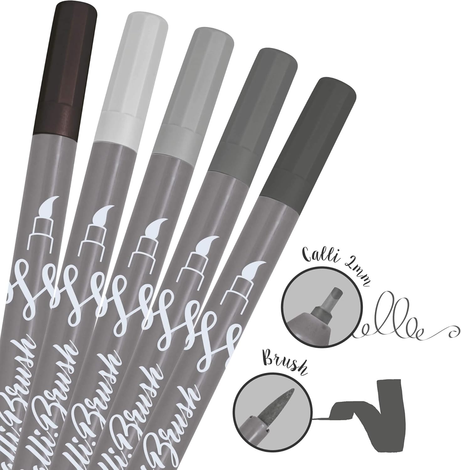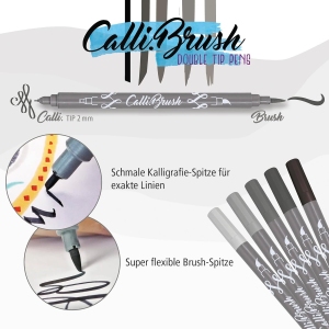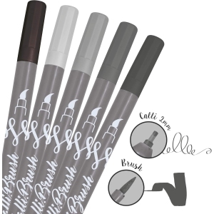 Ce set comprend cinq nuances allant du noir puissant à un élégant gris clair. Ces couleurs peuvent être mélangées et superposées, offrant un potentiel créatif immense. Que vous souhaitiez créer des effets d’ombre ou simplement ajouter une touche de sophistication à vos projets, les Calli.Brush sont là pour vous accompagner.