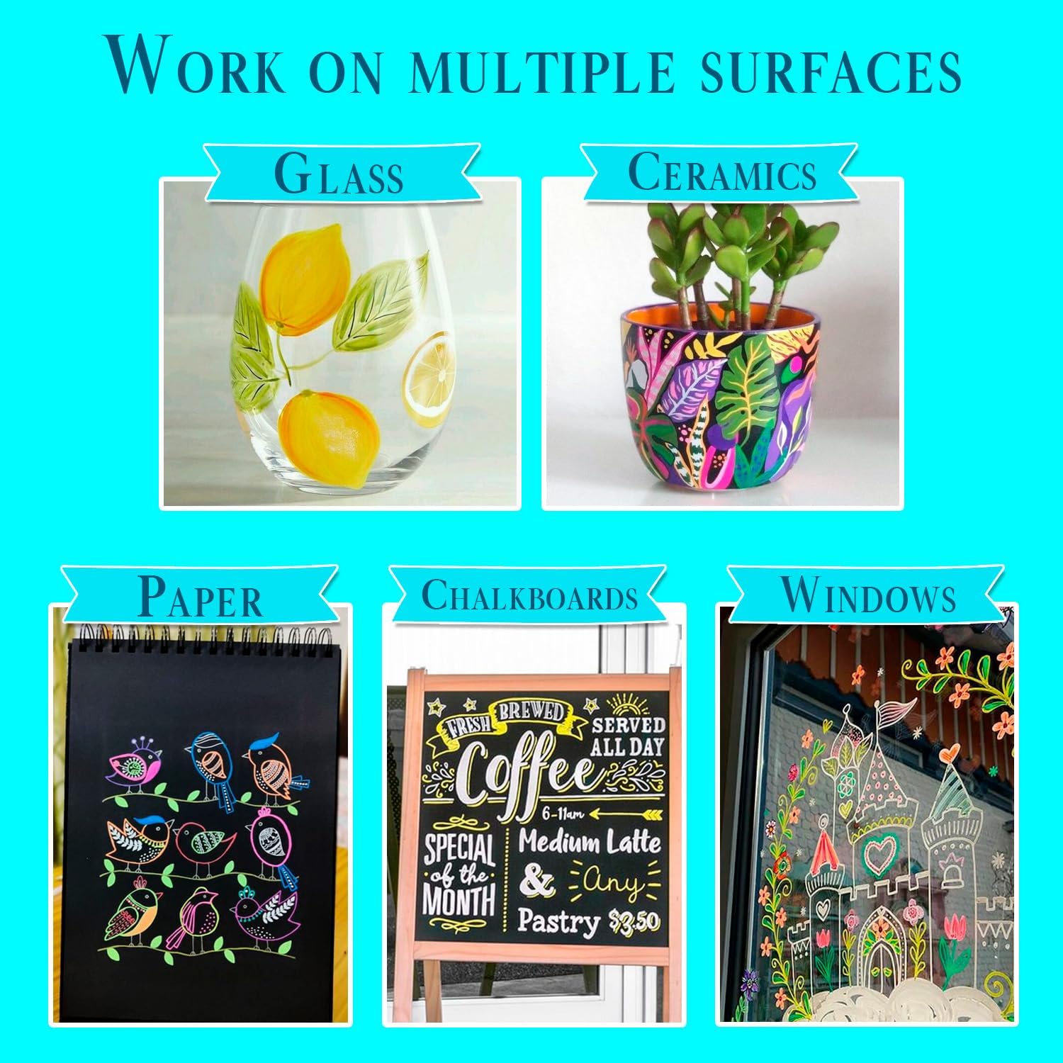 Ces feutres sont conçus pour être utilisés sur une multitude de surfaces non poreuses, offrant ainsi des possibilités créatives illimitées. Que ce soit pour écrire sur des tableaux noirs, des fenêtres, des miroirs, des ardoises ou même des tasses et des verres, ces feutres s’adaptent à vos besoins. Ils sont idéaux pour les menus de restaurant, les promotions en vitrine, les décorations de fêtes, les projets artistiques ou tout autre usage nécessitant une écriture ou un dessin temporaire.