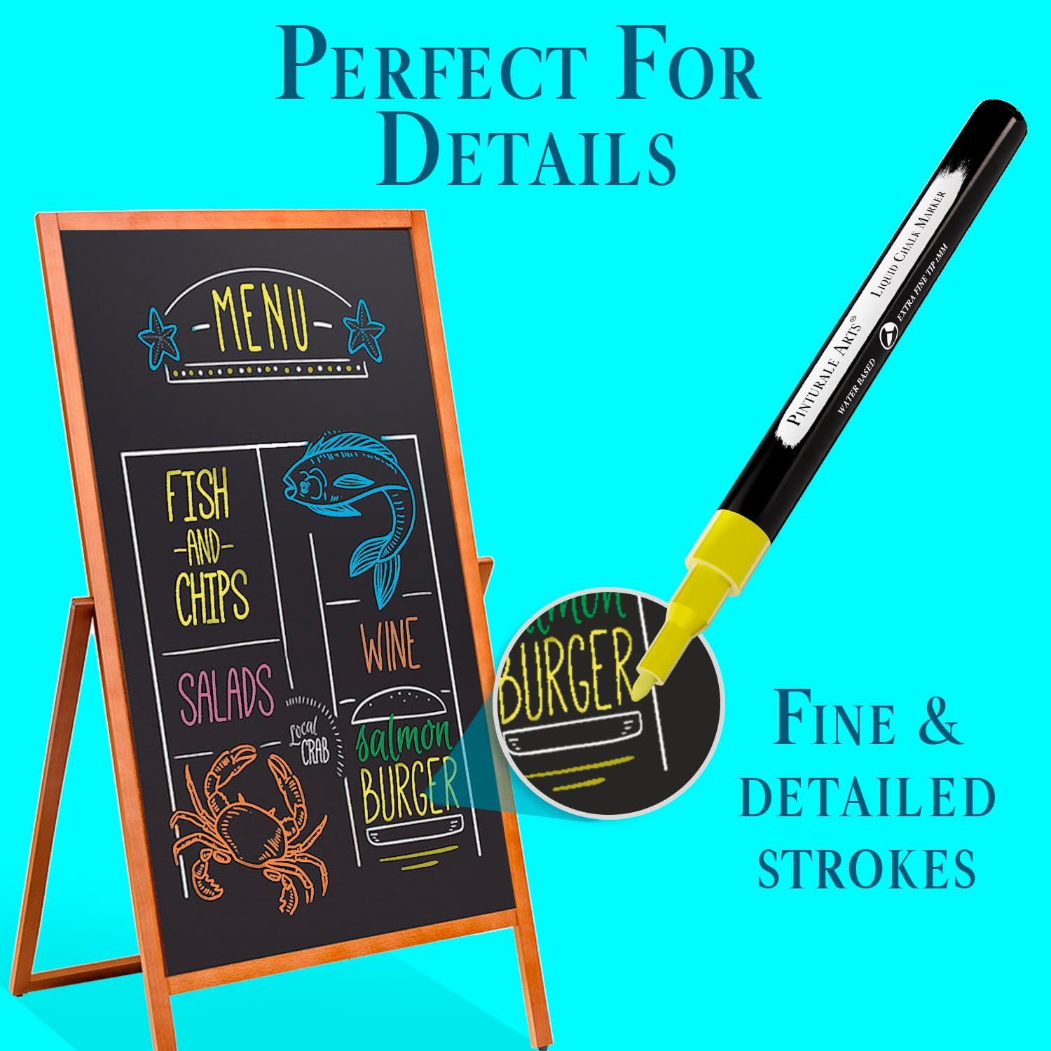 Sur le marché, plusieurs feutres à craie effaçables sont disponibles, chacun offrant des caractéristiques spécifiques. Par exemple, les marqueurs Chalkola proposent des feutres à pointe extra fine de 1 mm, similaires aux feutres Pinturale Arts, mais avec une palette de couleurs plus étendue, incluant des teintes métalliques comme l’or et l’argent. Cependant, ces teintes métalliques peuvent ne pas être adaptées à tous les types de surfaces ou d’applications.