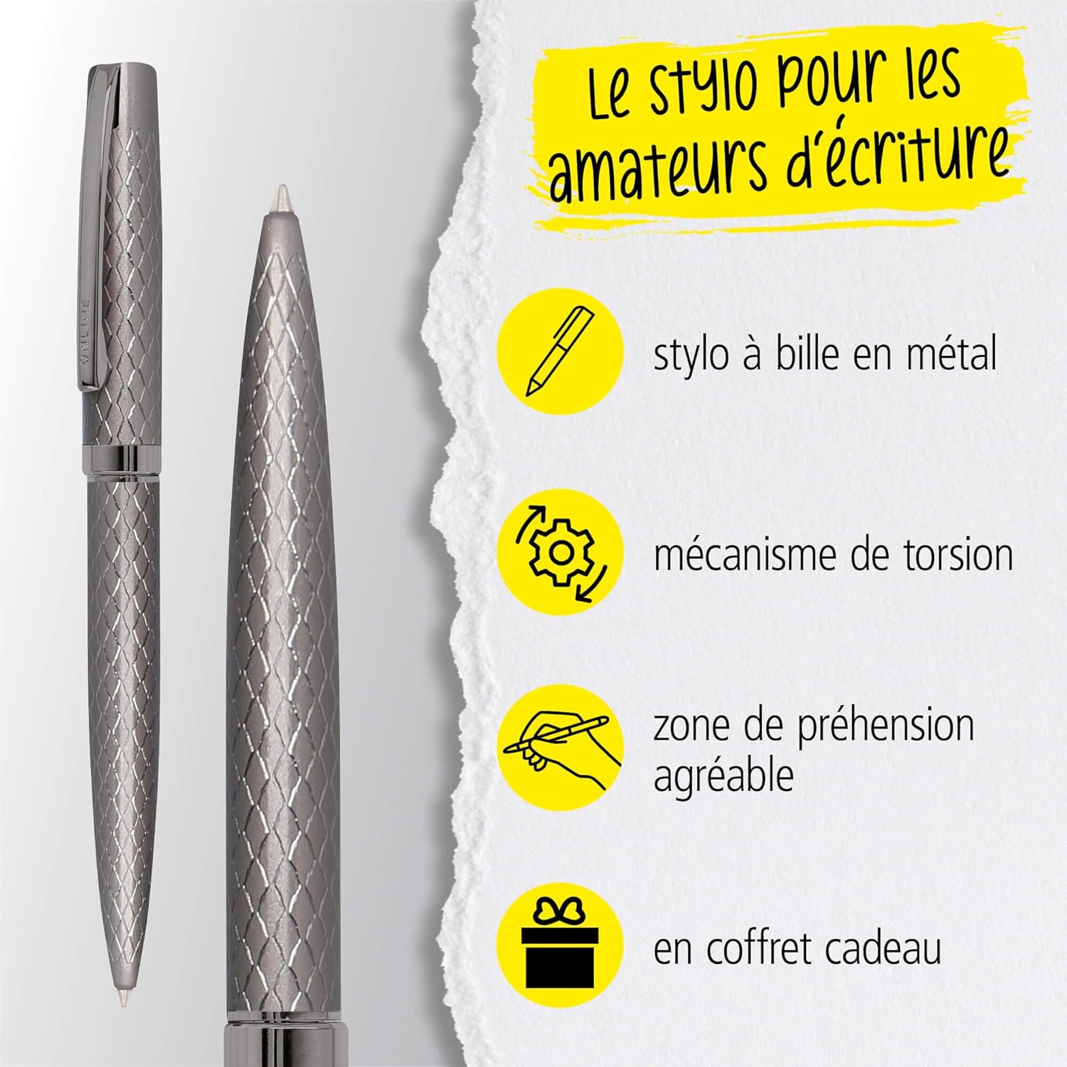 R : Oui, le stylo à bille Eleganza Diamond est livré dans un coffret cadeau exclusif, inclus dans le prix d’achat.
