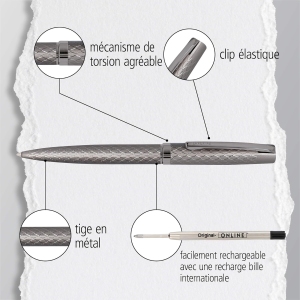 Le corps du stylo est fabriqué en métal de haute qualité, offrant une robustesse et une durabilité exceptionnelles. Sa finition couleur titan confère une allure moderne et intemporelle, idéale pour les professionnels et les passionnés d’écriture. Les détails brillants et le clip en métal ajoutent une touche de sophistication, faisant de ce stylo un accessoire élégant sur tout bureau ou espace de travail.