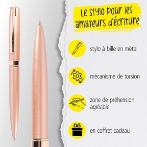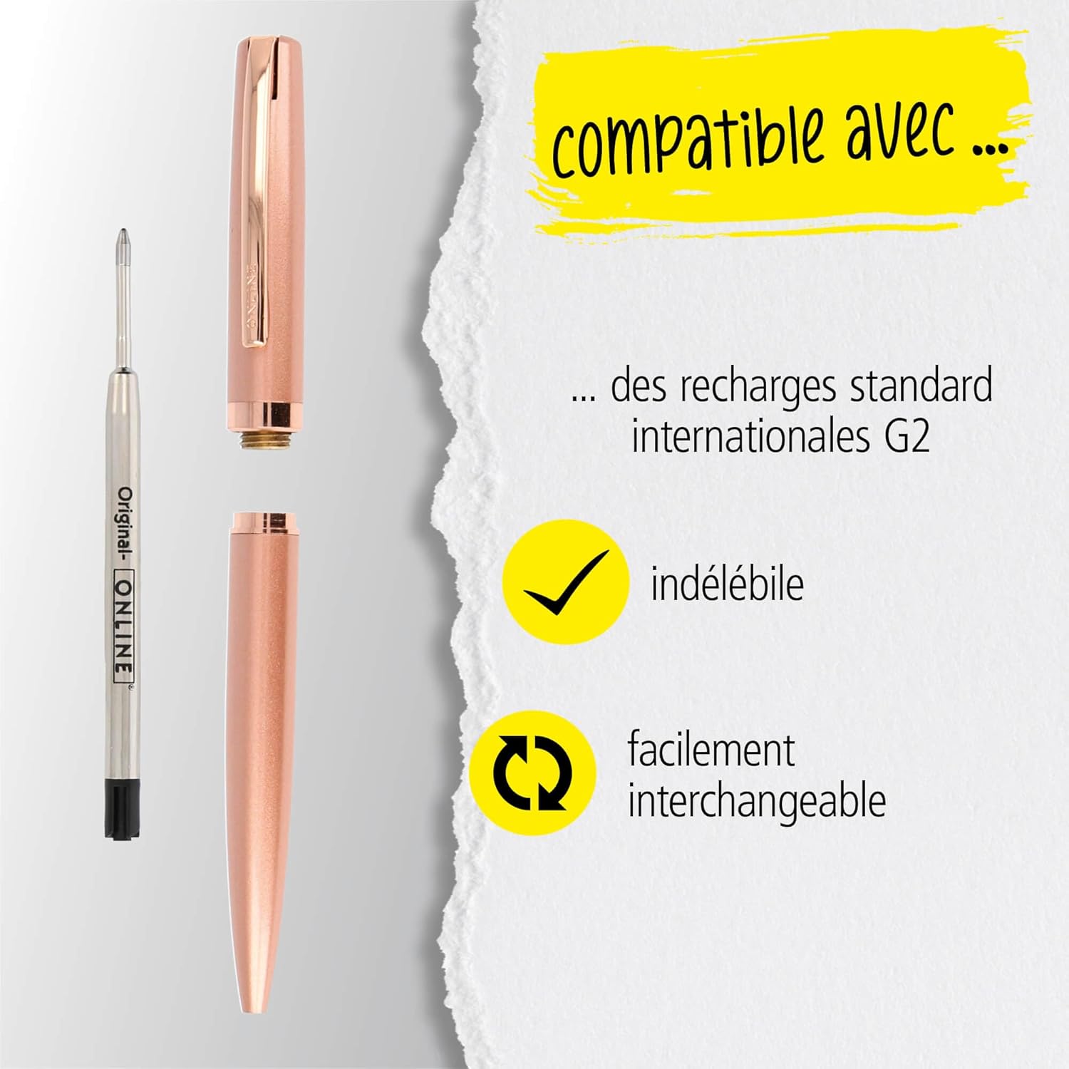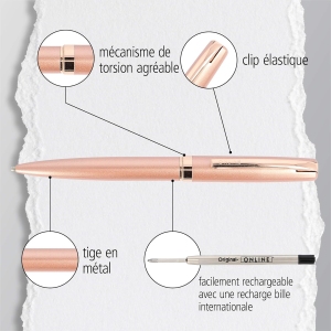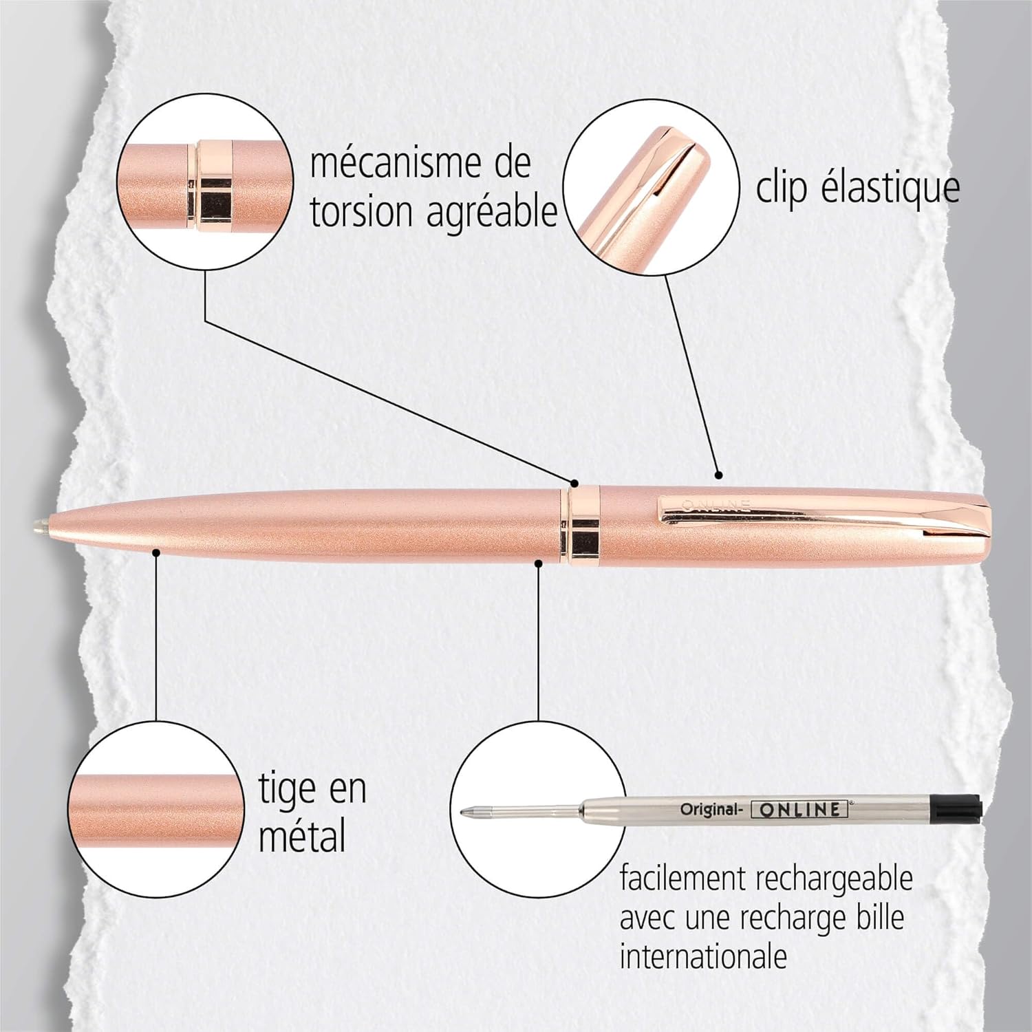 Le stylo à bille Eleganza d’ONLINE est un instrument d’écriture de qualité supérieure qui combine esthétique, fonctionnalité et durabilité. Son design en rosegold et son mécanisme de rotation en font un choix judicieux pour ceux qui recherchent un stylo alliant élégance et praticité. Que ce soit pour un usage personnel ou comme cadeau, le stylo Eleganza saura répondre aux attentes des utilisateurs les plus exigeants.