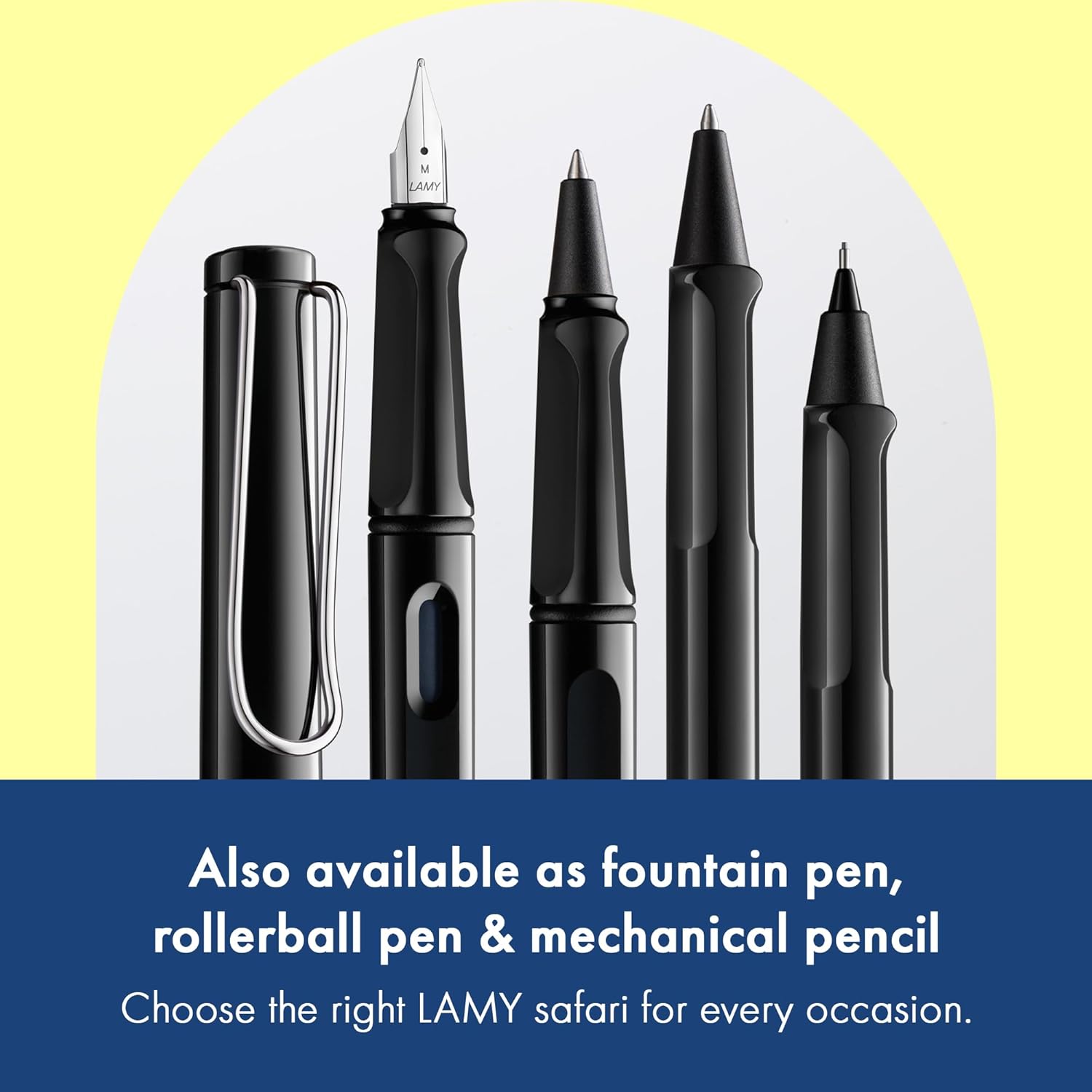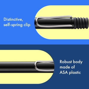Le Lamy Safari Black se distingue par son esthétique soignée. Son design emblématique, avec des lignes épurées et une large palette de couleurs, plaît à un large public. La finition mate de ce modèle noir lui donne une allure sophistiquée et professionnelle. Chaque détail a été pensé pour le plaisir visuel et tactile de l’utilisateur. Le clip en métal à ressort automatique ajoute à l’élégance de l’objet tout en offrant une fonctionnalité pratique, permettant de fixer le stylo facilement à un carnet ou à une chemise.