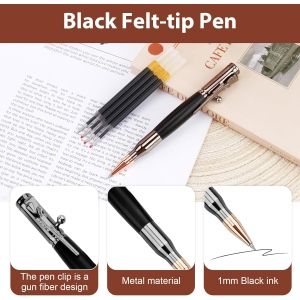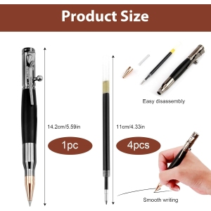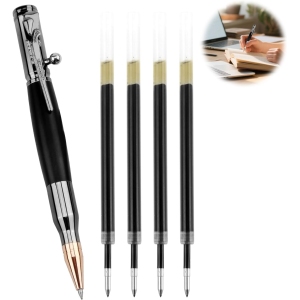 Superbe stylo. Le tube est en forme de balle de fusil et le haut du stylo représente le système de rechargement d’un vieux fusil. Vraiment très sympa. Vous avez une recharge dans le stylo et quatre recharges en plus, seul tout petit bémol, dommage qu’il n’y ait pas de petit coffret avec le stylo. Bon rapport qualité prix