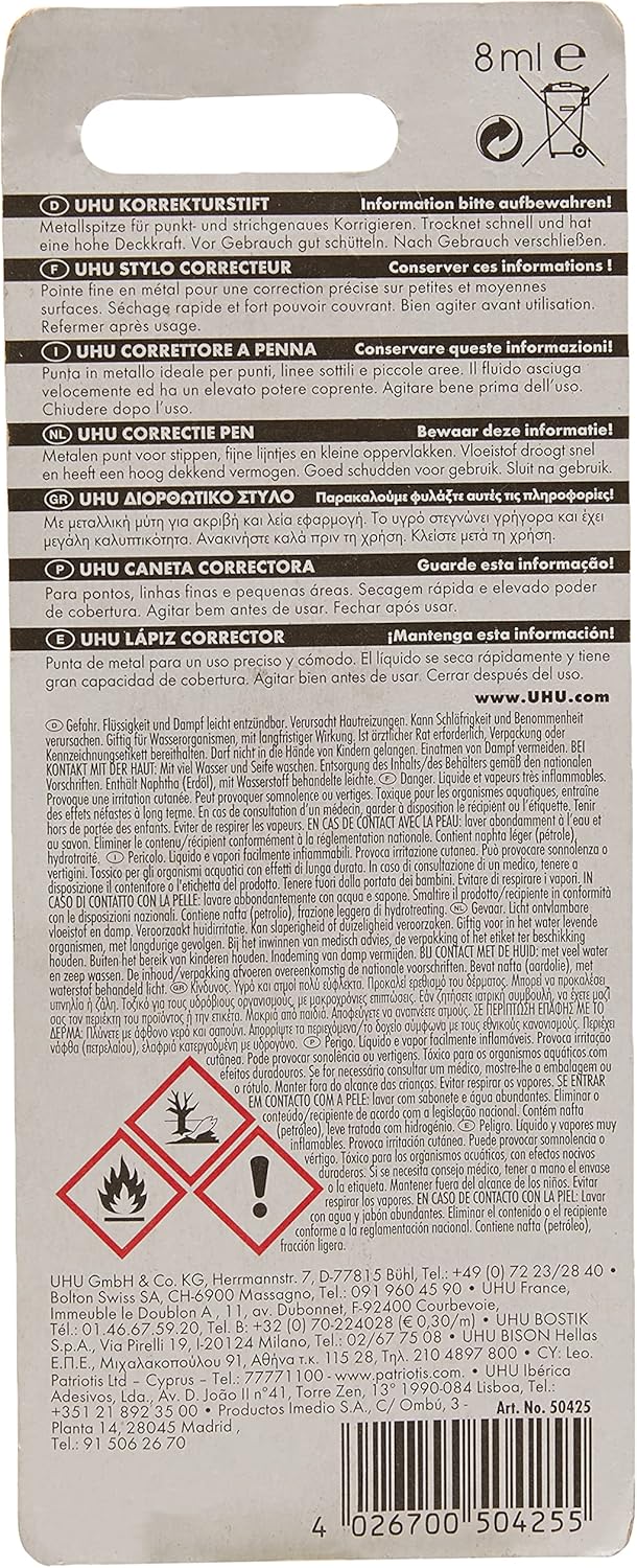 Le liquide correcteur, qui sèche rapidement, est idéal pour corriger des textes imprimés ou manuscrits. La formule fluide de UHU offre un excellent pouvoir couvrant, permettant de masquer efficacement les erreurs avec une seule application. Que ce soit pour la correction de petits détails ou de passages plus longs, ce stylo s’adapte parfaitement à toutes les circonstances.
