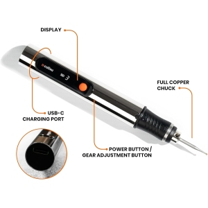 Équipé d’un moteur polyvalent à 3 vitesses (8000 à 21 000 tr/min) et d’un couple de 30 g/cm, ce stylo de gravure s’adapte à tous vos besoins créatifs, des gravures fines aux travaux plus robustes.