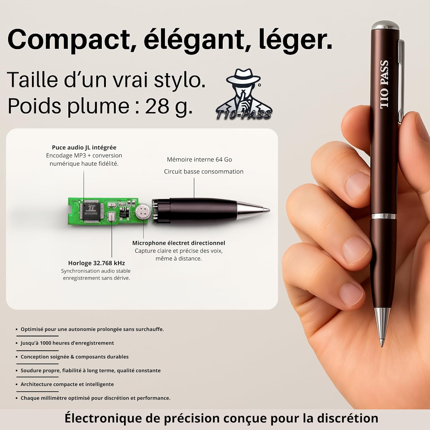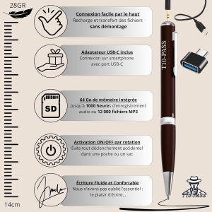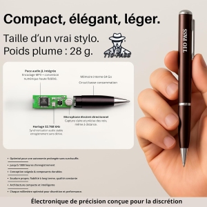 Discret, élégant et simple d’utilisation, le stylo enregistreur espion 64 Go de T10-PASS est l’outil idéal pour capturer ce qui compte sans attirer l’attention. Sa conception raffinée lui permet de se fondre dans n’importe quel environnement, que ce soit lors d’une réunion, d’une séance de cours, dans une voiture ou chez soi. Avec un simple mouvement de la bague, l’utilisateur peut lancer l’enregistrement, en mode continu ou avec détection automatique de la voix, offrant ainsi une souplesse d’utilisation précieuse.