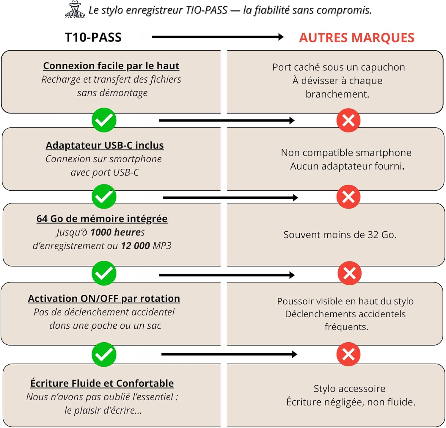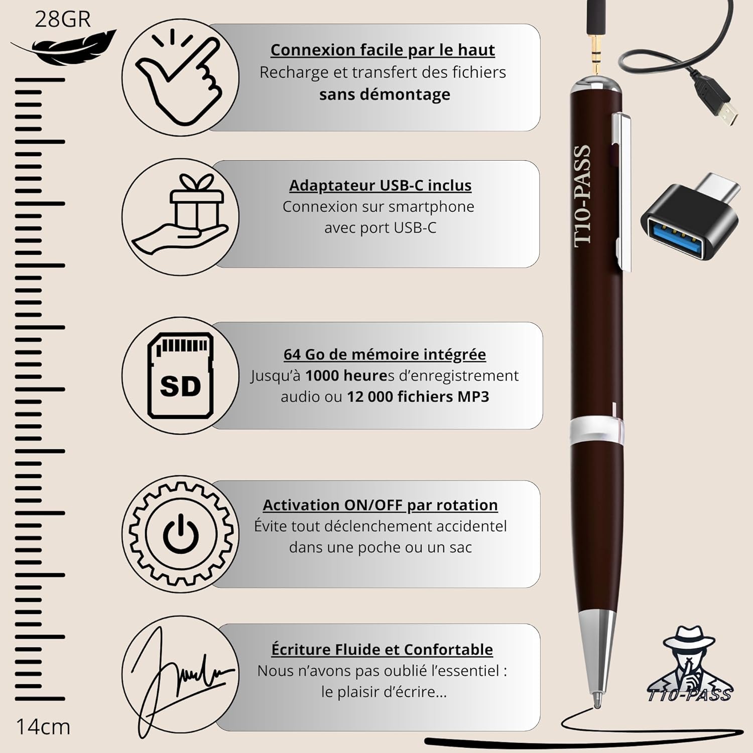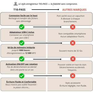 T10-PASS est une marque française à taille humaine, engagée à offrir un produit de qualité avec un support client réactif. La notice à votre disposition en quatre langues et la vidéo explicative accessible via QR code font partie des efforts de l’entreprise pour rendre l’utilisation de ce stylo enregistreur encore plus accessible. L’entreprise met un point d’honneur à être proche de ses clients, garantissant un suivi personnalisé.
