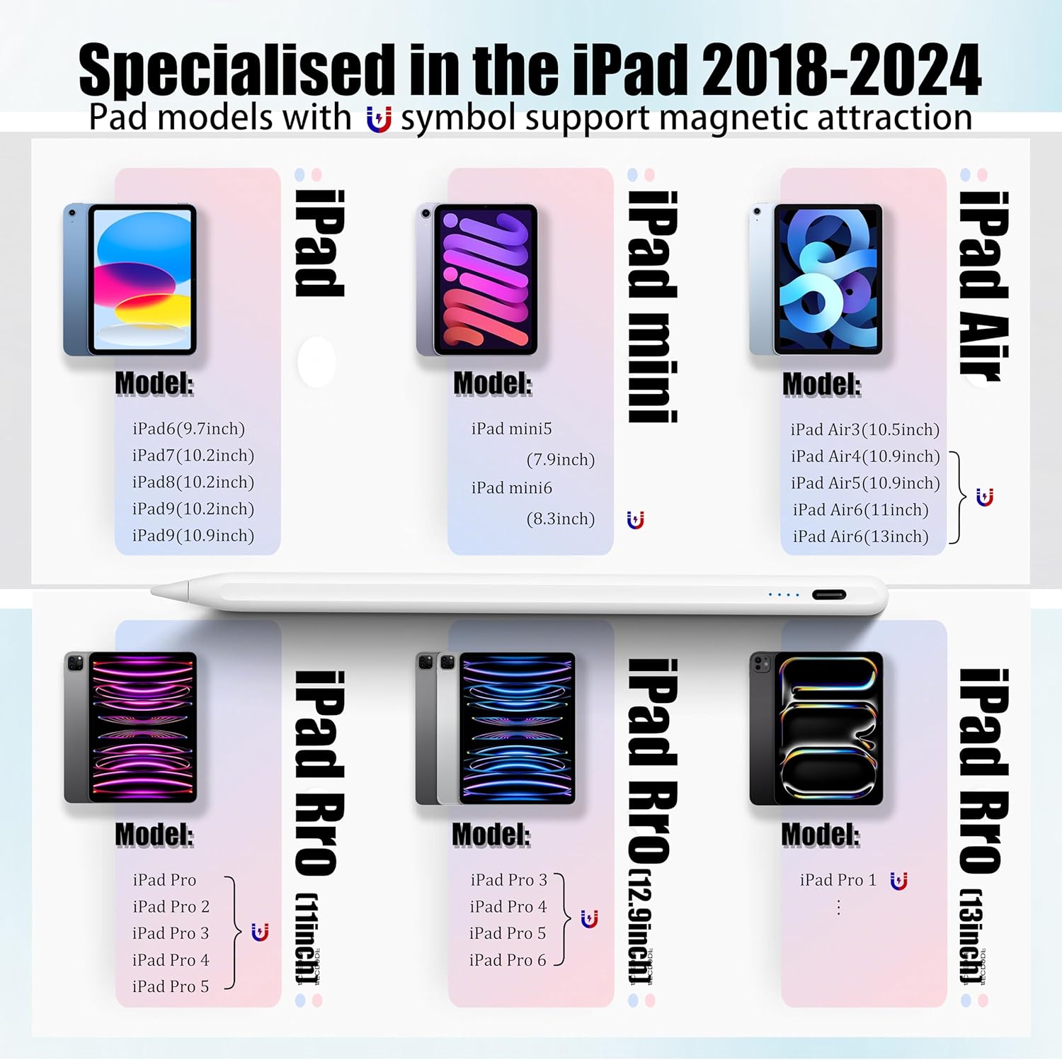 Ce stylet est compatible avec un vaste éventail de modèles d’iPad : iPad (6/7/8/9/10 Gen), iPad Air (3/4/5 Gen), iPad Pro 11” (1/2/3/4 Gen), et bien plus encore. Avant de commander, il est conseillé de vérifier le modèle de votre iPad dans les paramètres pour une compatibilité optimale.