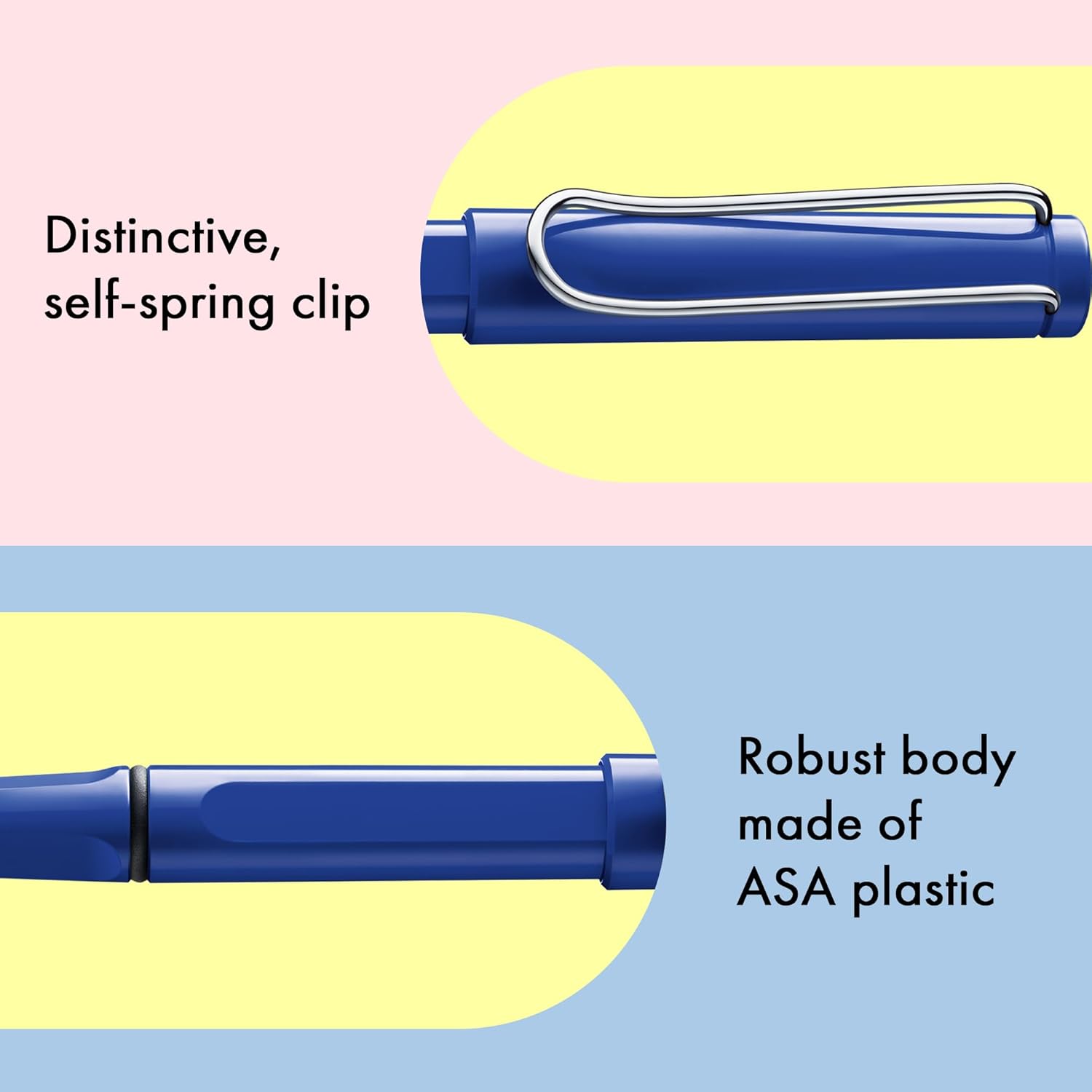 Le LAMY Safari Blue se distingue par son corps en plastique ASA (acrylonitrile-styrène-acrylate) robuste et brillant, garantissant une résistance accrue aux chocs et aux rayures. Ce matériau assure une durabilité optimale tout en conservant une légèreté appréciable pour une utilisation prolongée sans fatigue. Son clip métallique à ressort automatique, caractéristique de la gamme Safari, ajoute une touche d’élégance et de praticité, permettant de fixer aisément le stylo à une poche ou à un carnet.