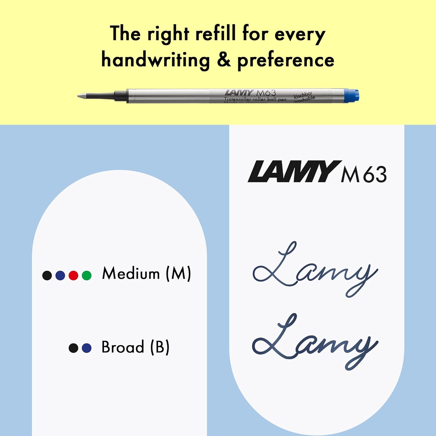 Le stylo est livré avec une recharge roller LAMY M 63 en bleu, offrant une largeur de trait moyenne (M) idéale pour une écriture nette et lisible. Cette recharge garantit un flux d’encre régulier, minimisant les risques de bavures et assurant une expérience d’écriture fluide. La compatibilité avec d’autres recharges LAMY permet une personnalisation selon les préférences de l’utilisateur, que ce soit en termes de couleur ou de type de pointe.