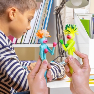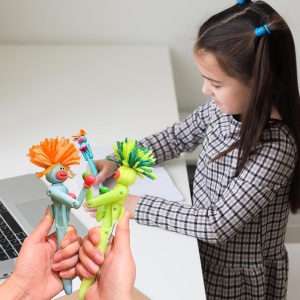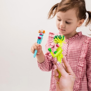Probably best for over the « putting things in their mouth » stage, as these come with two pen refills that could be chewed or swallowed. These are chunky enough for smaller hands to hold, & easy to operate. There’s one lever to operate each arm, so they can both be extended together or one at a time. Plus these are still fun even after the ink runs out. A great stocking filler or fidget toy.