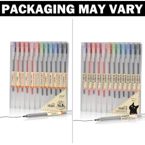 Ensemble de stylos gel dans le style des Muji pour ceux qui connaissent. Il y a un ensemble de couleurs qui sont très jolies, fonctionne très bien, même après un moment, pointe fine. Ils bavent légèrement après avoir écrit (comme tout stylo gel) mais sèchent assez rapidement, je n’ai pas eu de problème en faisant un peu attention.J’aime beaucoup ces stylos, je m’en sers très régulièrement dans mon journal ou pour écrire des lettres !