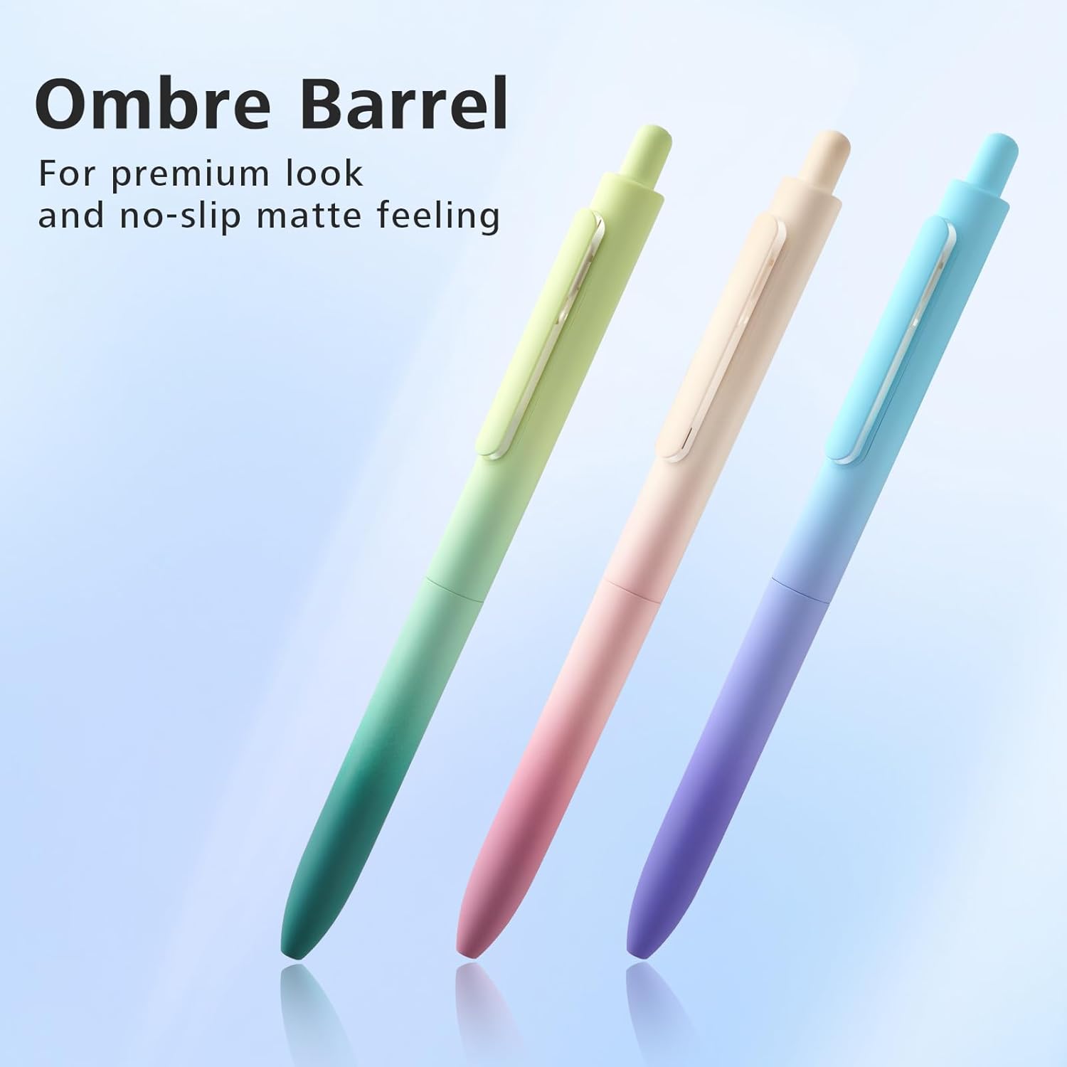 Le corps du stylo présente un fini mat nacré ombré, offrant une esthétique élégante et une prise en main confortable. Sa texture antidérapante assure une utilisation prolongée sans fatigue, tandis que le clip de type trappe permet de fixer le stylo à une poche ou à un carnet, facilitant son transport.