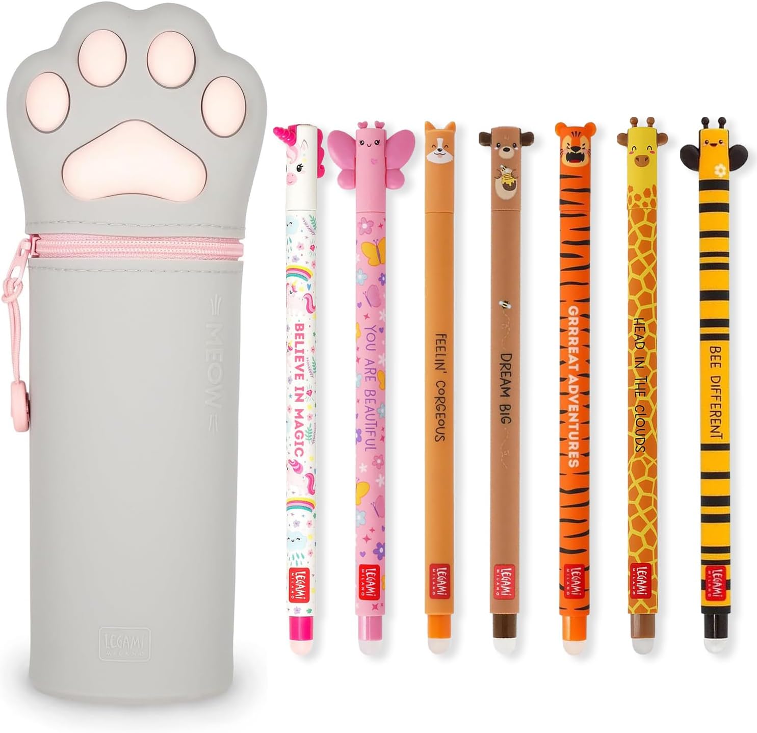 Le lot de 7 stylos gel effaçables Legami se distingue par ses motifs adorables et ses couleurs d’encre variées. Chaque stylo présente un dessin unique : licorne (encre rose), papillon (encre rose), Corgi (encre noire), ours en peluche (encre rouge), tigre (encre orange), girafe (encre noire) et abeille (encre noire). Ces motifs apportent une touche ludique et colorée à vos écrits, rendant l’écriture plus agréable et motivante. (cdiscount.com)