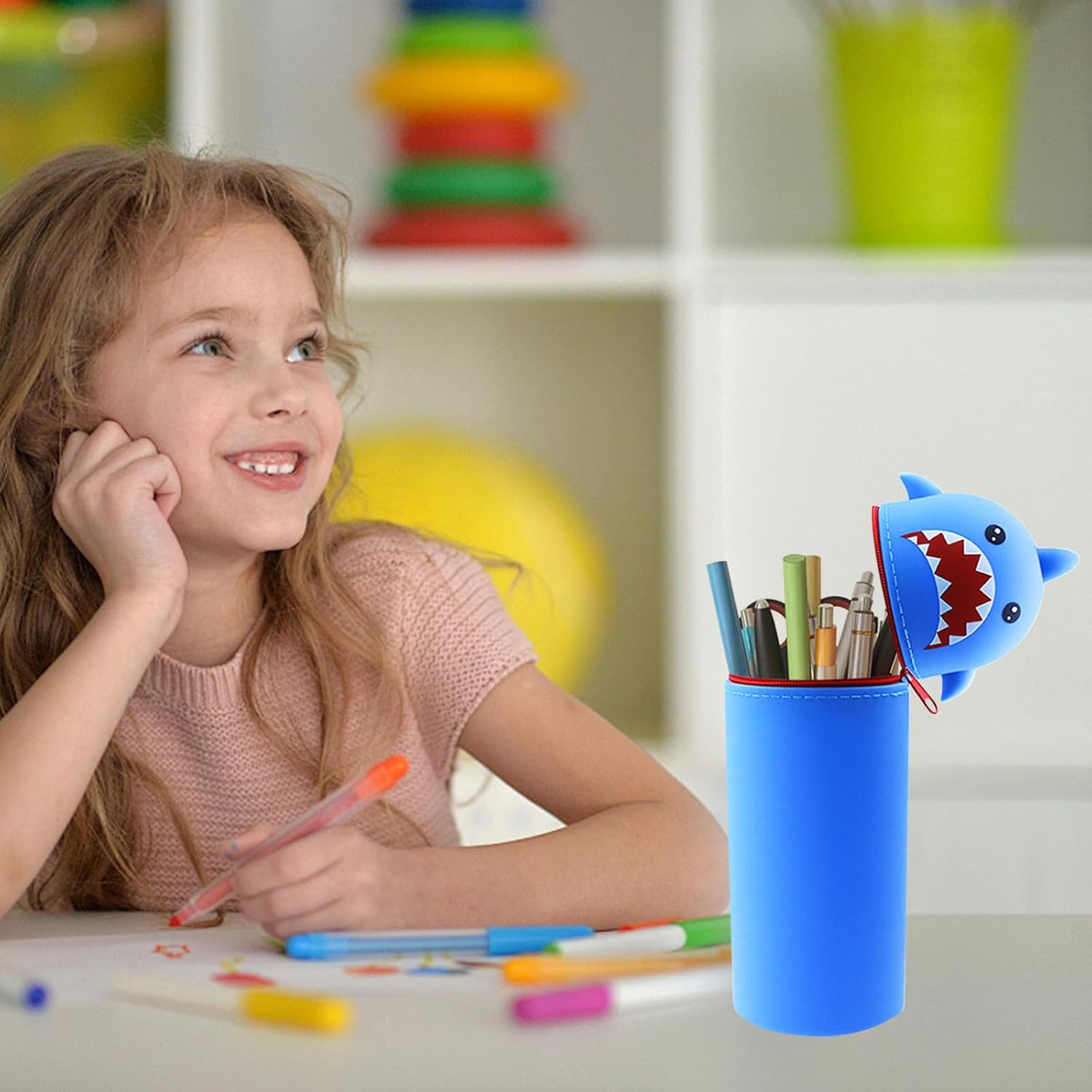 rousse originale avec sa forme de requin, elle plaît beaucoup. Le silicone est souple et facile à nettoyer. Assez de place pour les stylos essentiels, sans être encombrante. Bonne idée pour allier fun et utilité au quotidien 🎒📚
